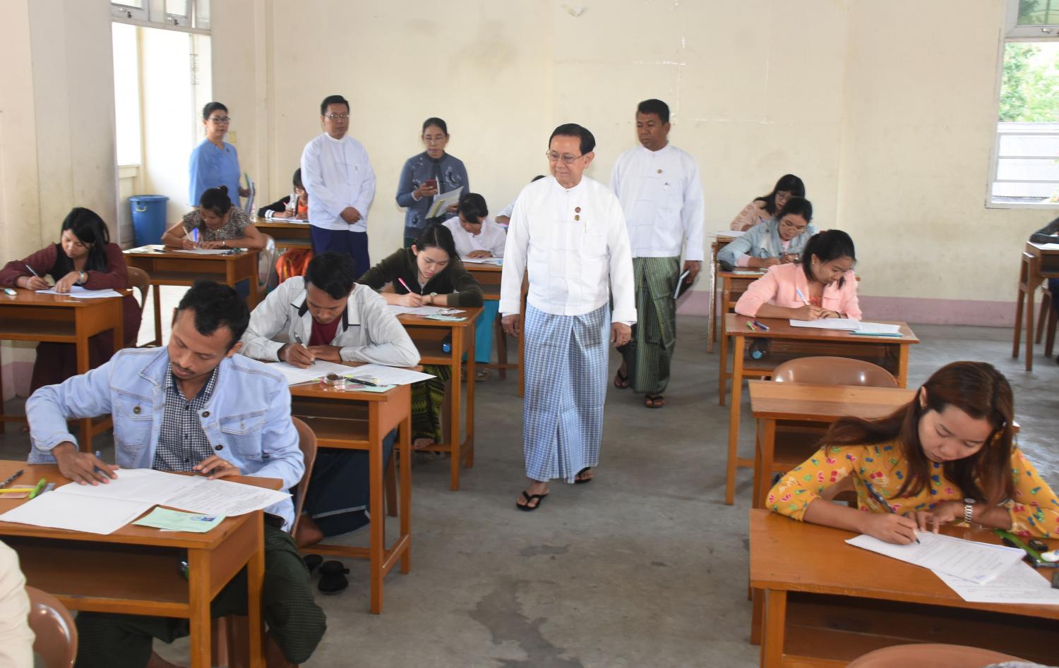ပြည်ထောင်စုရာထူးဝန်အဖွဲ့ ဥက္ကဋ္ဌ ဦးဝင်းသိမ်း နိုင်ငံ့ဝန်ထမ်း ပြန်တမ်းဝင်အရာရှိအဆင့် ဝင်ပေါက်ရာထူးများအတွက် ဒုတိယအဆင့် ရေးဖြေ စာမေးပွဲကျင်းပနေမှု ကြည့်ရှုအားပေး