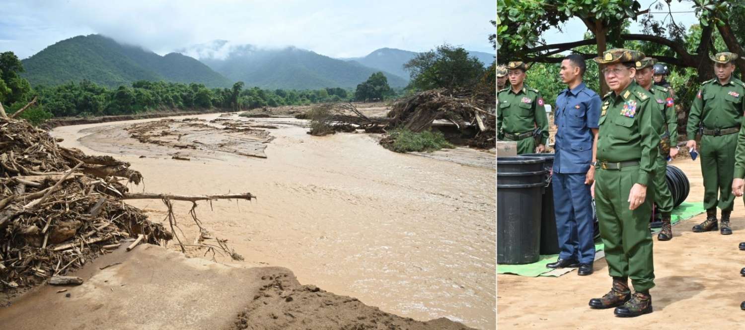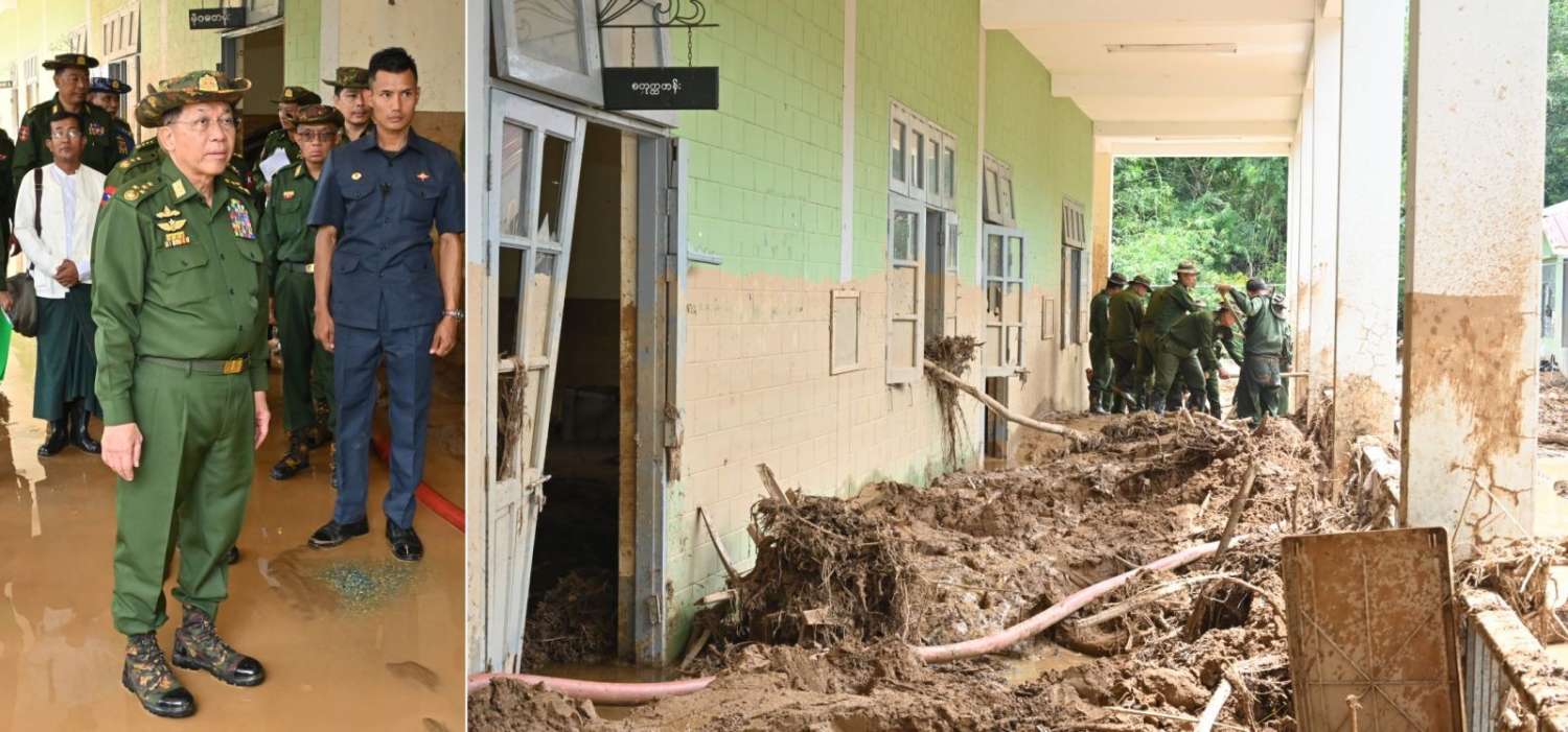 ဆက်လက်ပြီး နိုင်ငံတော်စီမံအုပ်ချုပ်ရေးကောင်စီဥက္ကဋ္ဌ တပ်မတော်ကာကွယ်ရေးဦးစီးချုပ်နှင့် အဖွဲ့ဝင်များသည် နယ်မြေခံတပ်ဌာနချုပ်၊ အိမ်ထောင်သည်လိုင်းခန်းများအတွင်း တောင်ကျချောင်းရေဝင်ရောက်ခဲ့မှုကြောင့် ပျက်စီးခဲ့မှုအခြေအနေများကို လိုက်လံကြည့်ရှုစစ်ဆေးခဲ့ပြီး မိသားစုဝင်များအား ရင်းရင်းနှီးနှီး လိုက်လံနှုတ်ဆက်အားပေးစကားပြောကြားသည်။