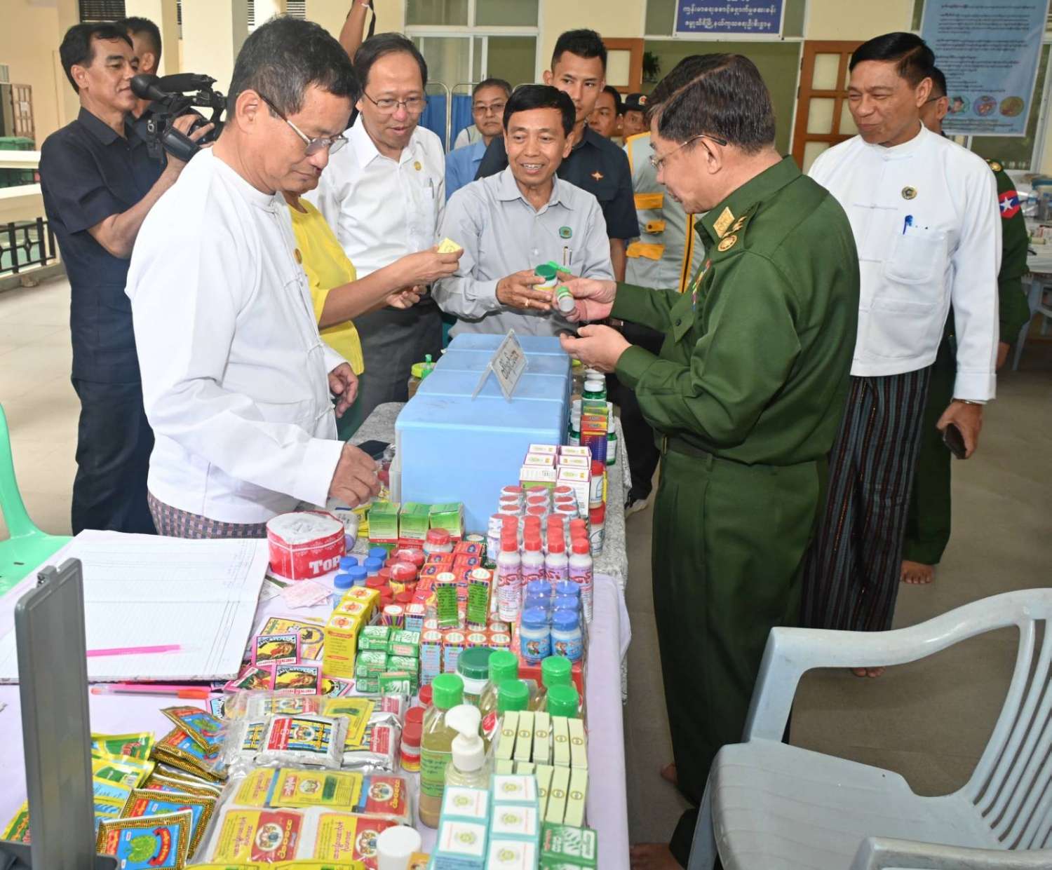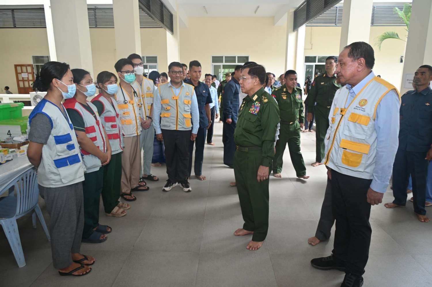 ၎င်းနောက် နိုင်ငံတော်စီမံအုပ်ချုပ်ရေးကောင်စီဥက္ကဋ္ဌ တပ်မတော်ကာကွယ်ရေးဦးစီးချုပ်နှင့် အဖွဲ့ဝင်များသည် ရေဘေးသင့်ပြည်သူများအတွက် ကျန်းမာရေးဝန်ကြီးဌာနမှ ကျန်းမာရေးစောင့်ရှောက်မှုဆေးခန်းဖွင့်လှစ်၍ ဆောင်ရွက်ပေးထားမှုများကို ကြည့်ရှုစစ်ဆေးပြီး တာဝန်ခံများ၏ တင်ပြချက်များအပေါ် လိုအပ်သည်များမှာကြားသည်။