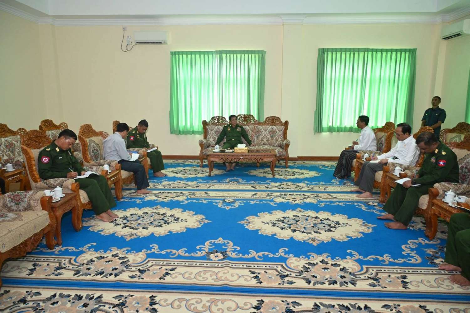 ထို့နောက် နိုင်ငံတော်စီမံအုပ်ချုပ်ရေးကောင်စီဥက္ကဋ္ဌ တပ်မတော်ကာကွယ်ရေးဦးစီးချုပ်သည် မင်္ဂလာဗျူဟာသာသနာ့ဗိမာန်ဧည့်ခန်းမဆောင်၌ တာဝန်ရှိသူများအားတွေ့ဆုံ၍ ယခုဖြစ်ပေါ်ခဲ့သည့် သဘာဝဘေးကြောင့် ထိခိုက်ပျက်စီးခဲ့မှုများကို အမြန်ဆုံးစာရင်းကောက်ယူ၍ အချက်အလက်များ ပြုစုဆောင်ရွက်သွားရန်လိုကြောင်း၊ အိုးအိမ်များပျက်စီးမှုတွင် လုံးဝပြိုကျပျက်စီးဆုံးရှုံးခြင်း၊ တစ်စိတ်တစ်ပိုင်းပျက်စီးဆုံးရှုံးခြင်း၊ တိုက်အိမ်၊ ပျဉ်ထောင်အိမ်၊ တဲအိမ် စသည်ဖြင့် ထိခိုက်ပျက်စီးမှုများအလိုက် ဆုံးရှုံးမှုတန်ဖိုးများကို အပိုင်းလိုက်သတ်မှတ်ကာ ပျက်စီးမှုရာခိုင်နှုန်းအလိုက်ထောက်ပံ့မှုများ ပမာဏသတ်မှတ် ဆောင်ရွက်ပေးသွားရန်လိုကြောင်း၊ ထိုနည်းတူ သေဆုံးခဲ့ရသူများအတွက်လည်း နိုင်ငံတော်အနေဖြင့် ငွေကြေးထောက်ပံ့ပေးခြင်းများ၊ တိုင်းဒေသကြီးနှင့်ပြည်နယ်အလိုက်၊ ဝန်ကြီးဌာနအလိုက် ငွေကြေးထောက်ပံ့ပေးခြင်းများ ဆောင်ရွက်ပေးသွားရမည်ဖြစ်ကြောင်း၊ ထိခိုက်ဒဏ်ရာရရှိသူများကိုလည်း ထိခိုက်မှုအနည်းအများအလိုက် ထောက်ပံ့မှုများ ဆောင်ရွက်ပေးသွားရမည်ဖြစ်ကြောင်း၊ ထောက်ပံ့မှုများ ဆောင်ရွက်ပေးနိုင်ရေးအတွက် စာရင်းကောက်ယူခြင်းများ၊ ငွေကြေး တွက်ချက်ခြင်းလုပ်ငန်းများကို မြန်မြန်ဆန်ဆန်ဖြင့် ဆောင်ရွက်သွားရန်လိုပြီး ထိခိုက်ခဲ့ရသူများကို အမြန်ဆုံးထောက်ပံ့ပေးအပ်နိုင်ရေး ဆက်လက်ဆောင်ရွက်သွားကြရန်လိုကြောင်း။