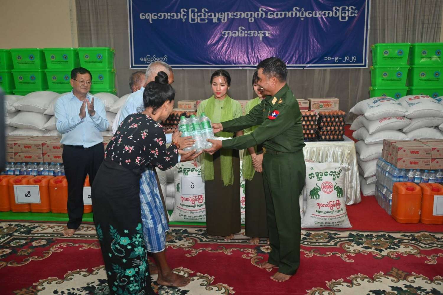 ထို့နောက် နိုင်ငံတော်စီမံအုပ်ချုပ်ရေးကောင်စီဥက္ကဋ္ဌ တပ်မတော်ကာကွယ်ရေးဦးစီးချုပ် ရေဘေးသင့်ပြည်သူများအတွက် ထောက်ပံ့ငွေနှင့်စားသောက်ဖွယ်ရာ ပစ္စည်းများကိုပေးအပ်ရာ ရေဘေးသင့်ပြည်သူများကိုယ်စား ကိုယ်စားလှယ်များက လက်ခံရယူသည်။