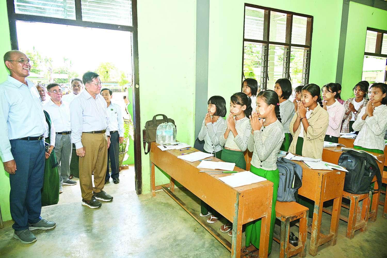 ထို့နောက် နိုင်ငံတော်စီမံအုပ်ချုပ်ရေးကောင်စီဥက္ကဋ္ဌ နိုင်ငံတော်ဝန်ကြီးချုပ်နှင့် အဖွဲ့ဝင်များသည် ရေဝင်ရောက်မှုများ ဖြစ်ပေါ်ခဲ့သည့် အဆုံဇီးကုန်းကျေးရွာအခြေခံပညာမူလတန်းကျောင်း၌ ကျောင်းသား ကျောင်းသူများ စာပေသင်ကြားနေမှုများကို သွားရောက်ကြည့်ရှုအားပေးပြီး ကျောင်းသား ကျောင်းသူများ၊ ဆရာ၊ ဆရာမများအတွက် စားသောက်ဖွယ်ရာများ ပေးအပ်ကာ ရင်းရင်းနှီးနှီးနှုတ်ဆက်သည်။ ထို့နောက် နုန်းများ ဖယ်ရှားရှင်းလင်းခြင်းနှင့် သန့်ရှင်းရေး လုပ်ငန်းများ ဆောင်ရွက်ပေးနေကြသည့် မြန်မာနိုင်ငံရဲတပ်ဖွဲ့ဝင်များ၊ မီးသတ်တပ်ဖွဲ့ဝင်များအား ကြည့်ရှုအားပေးပြီး စားသောက်ဖွယ်ရာပစ္စည်းများ ချီးမြှင့်ပေးအပ်သည်။