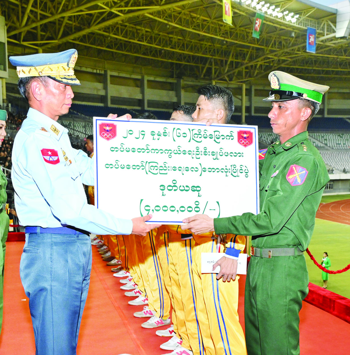 နိုင်ငံတော်စီမံအုပ်ချုပ်ရေးကောင်စီဥက္ကဋ္ဌ တပ်မတော်ကာကွယ်ရေးဦးစီးချုပ် ဗိုလ်ချုပ်မှူးကြီး မင်းအောင်လှိုင် ၂ဝ၂၄ ခုနှစ်၊ တပ်မတော် (ကြည်း၊ ရေ၊ လေ) အားကစားပြိုင်ပွဲ ဆုချီးမြှင့်ပွဲ အခမ်းအနားသို့ တက်ရောက်၍ ဆုများပေးအပ်ချီးမြှင့်