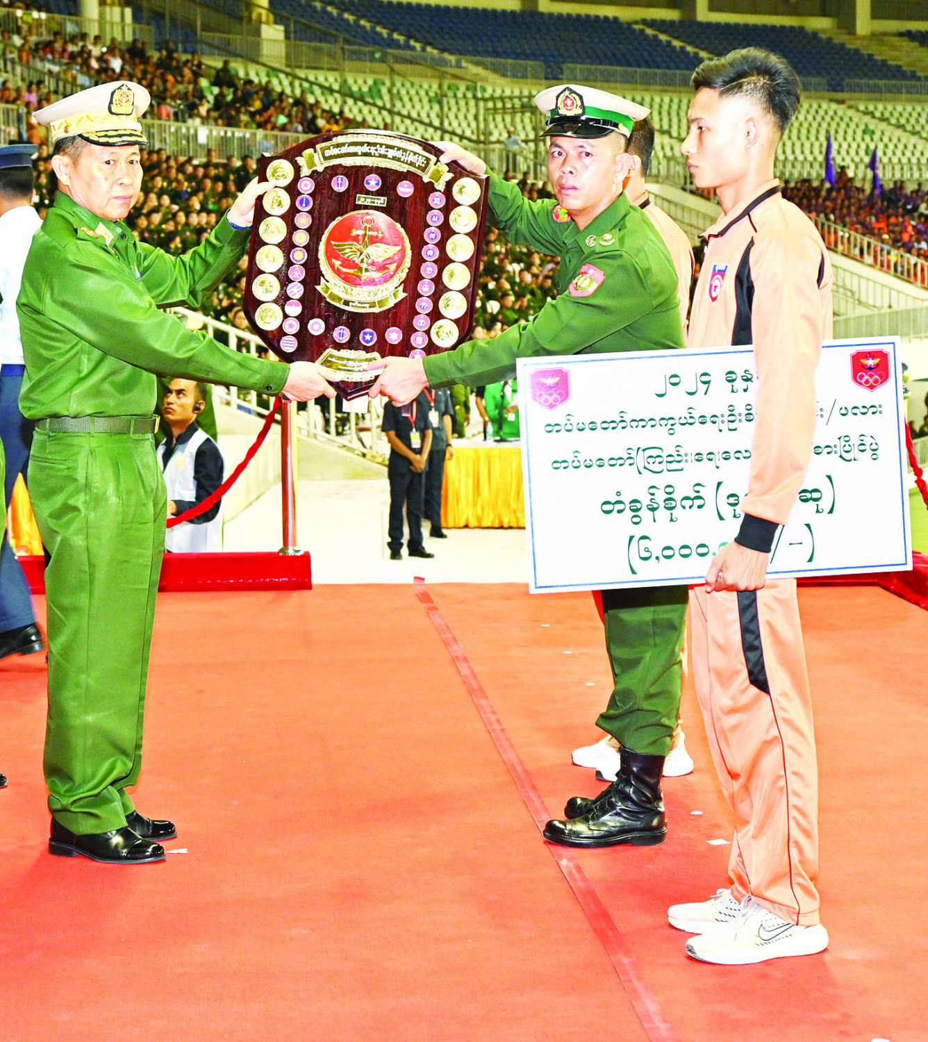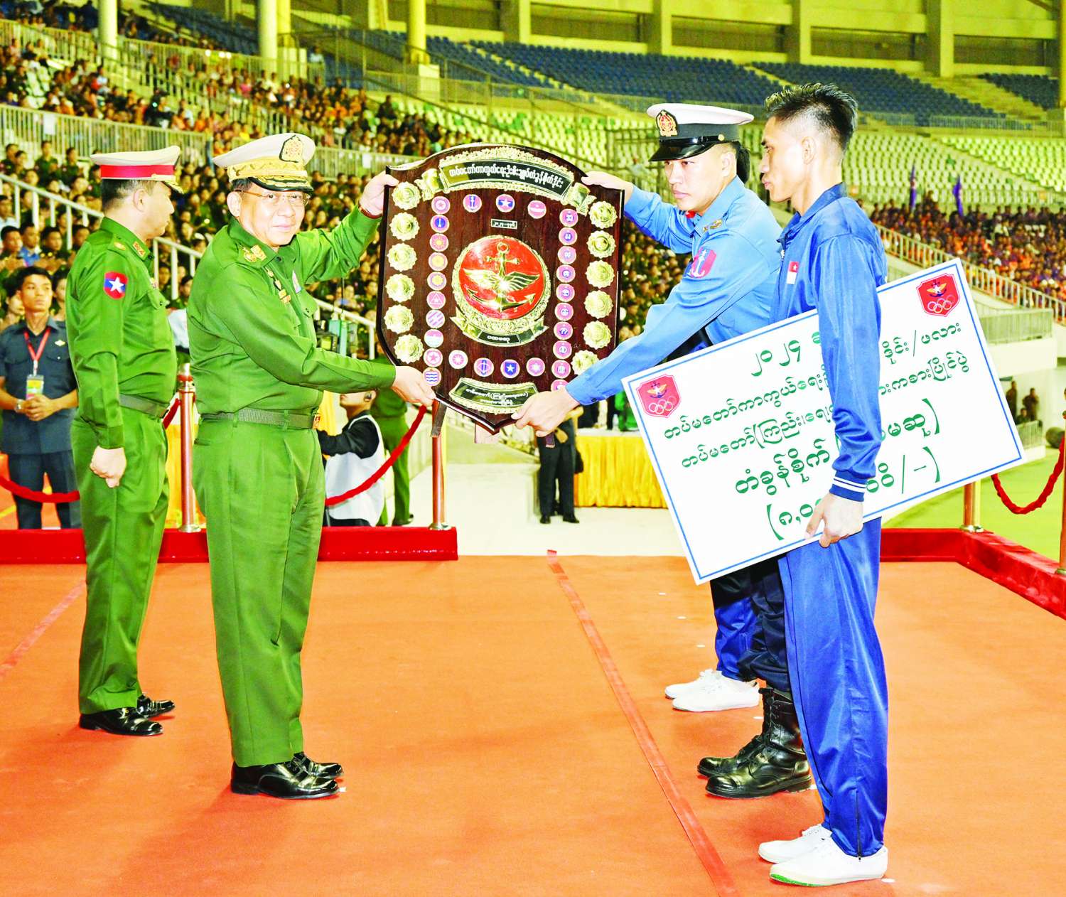 ထို့နောက် နိုင်ငံတော်စီမံအုပ်ချုပ်ရေးကောင်စီဥက္ကဋ္ဌ တပ်မတော်ကာကွယ်ရေးဦးစီးချုပ် ဗိုလ်ချုပ်မှူးကြီးမင်းအောင်လှိုင်က ၂၀၂၄ ခုနှစ်၊ တပ်မတော် (ကြည်း၊ ရေ၊ လေ) အားကစားပြိုင်ပွဲများတွင် ရွှေတံဆိပ် ၆၅ ခု၊ ငွေတံဆိပ် ၄၃ ခု၊ ကြေးတံဆိပ် ၄၁ ခု၊ စုစုပေါင်းဆုတံဆိပ် ၁၄၉ ခုဖြင့် ဆုအများဆုံးရရှိသည့် ကာကွယ်ရေးဦးစီးချုပ်ရုံး (ရေ)ကိုယ်စားပြုအသင်းအား တပ်မတော်ကာကွယ်ရေးဦးစီးချုပ်၏ တံခွန်စိုက်ဒိုင်းဆုကြီးနှင့် ငွေသားဆုများကို ပေးအပ်ချီးမြှင့်ရာ အသင်းအုပ်ချုပ်သူအရာရှိနှင့် အားကစားသမားများက လက်ခံရယူသည်။