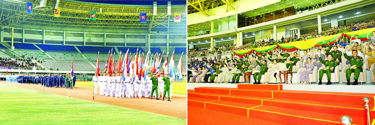 ယင်းနောက် တပ်မတော် (ကြည်း၊ ရေ၊ လေ) စစ်တီးဝိုင်းအဖွဲ့နှင့်အတူ စစ်ရေးပြမှူးကြီးဦးဆောင်၍ အလံတော်အဖွဲ့၊ အားကစားအသင်း ၁၇ သင်းနှင့် ဆုရဘောလုံးအသင်း ၃ သင်းတို့မှ အားကစားသမားများက ဇေယျာသီရိတပ်မတော် အားကစားကွင်းအတွင်း ဝင်ရောက်နေရာယူကြသည်။