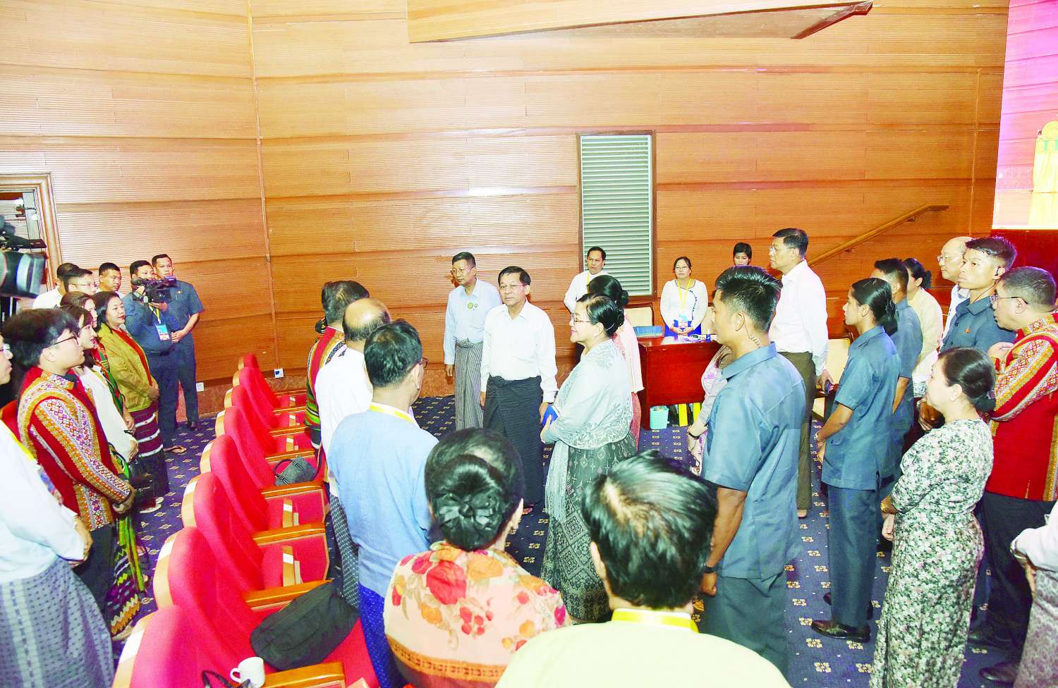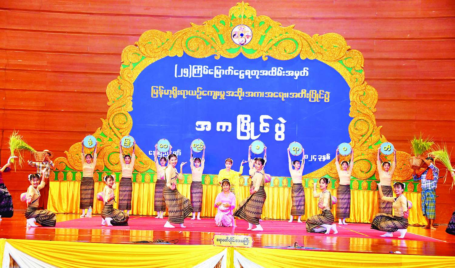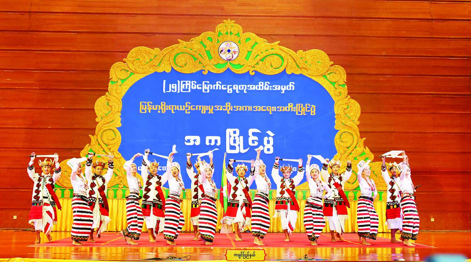 ဦးစွာ နိုင်ငံတော်စီမံအုပ်ချုပ်ရေးကောင်စီဥက္ကဋ္ဌ နိုင်ငံတော်ဝန်ကြီးချုပ်နှင့် ဇနီး၊ အဖွဲ့ဝင်များသည် Plenary Hall ၌ ကျင်းပလျက်ရှိသည့် တိုင်းရင်းသားရိုးရာ/ ကျေးလက်ရိုးရာ အလွတ်တန်းအဆင့်အကပြိုင်ပွဲတွင် တိုင်းဒေသကြီးနှင့်ပြည်နယ်အလိုက် ရိုးရာအကအဖွဲ့များက တိုင်းရင်းသားနှင့် ကျေးလက်ရိုးရာဓလေ့ စရိုက်များ ပေါ်လွင်စေသည့် အကအလှများဖြင့် အဖွဲ့လိုက် အချိုးအဆစ်ညီညာပြေပြစ် ရသမြောက်စွာ ကပြယှဉ်ပြိုင်နေမှုများကို အားပေးကြည့်ရှုကြသည်။