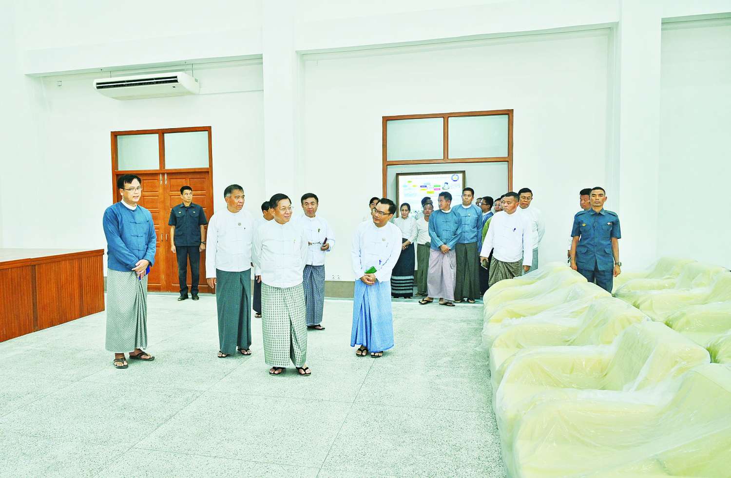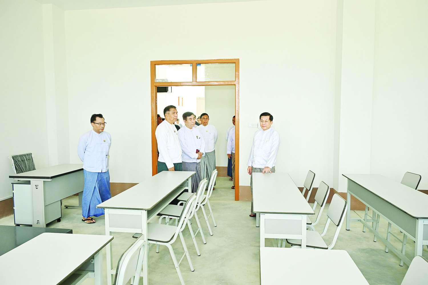 ယင်းနောက် နိုင်ငံတော်စီမံအုပ်ချုပ်ရေးကောင်စီဥက္ကဋ္ဌ နိုင်ငံတော်ဝန်ကြီးချုပ်သည် ပင်မစာသင်ဆောင်အတွင်းသို့ ရောက်ရှိကြပြီး ကျောင်းသားစုဝေးခန်းမ၊ ဘွဲ့နှင်းသဘင်ခန်းမ၊ စာသင်ခန်းများ၊ လက်တွေ့ခန်းများ၊ ယာယီစာကြည့်တိုက်နှင့် အထောက်အကူပြုခန်းများ ဖွဲ့စည်းဆောင်ရွက်ထားရှိမှုအခြေအနေများကို ကဏ္ဍတစ်ခုချင်းစီအလိုက် အသေးစိတ်လိုက်လံကြည့်ရှုစစ်ဆေးခဲ့ပြီး တာဝန်ရှိသူများ၏တင်ပြချက်များအပေါ် လိုအပ်သည်များ မှာကြားသည်။