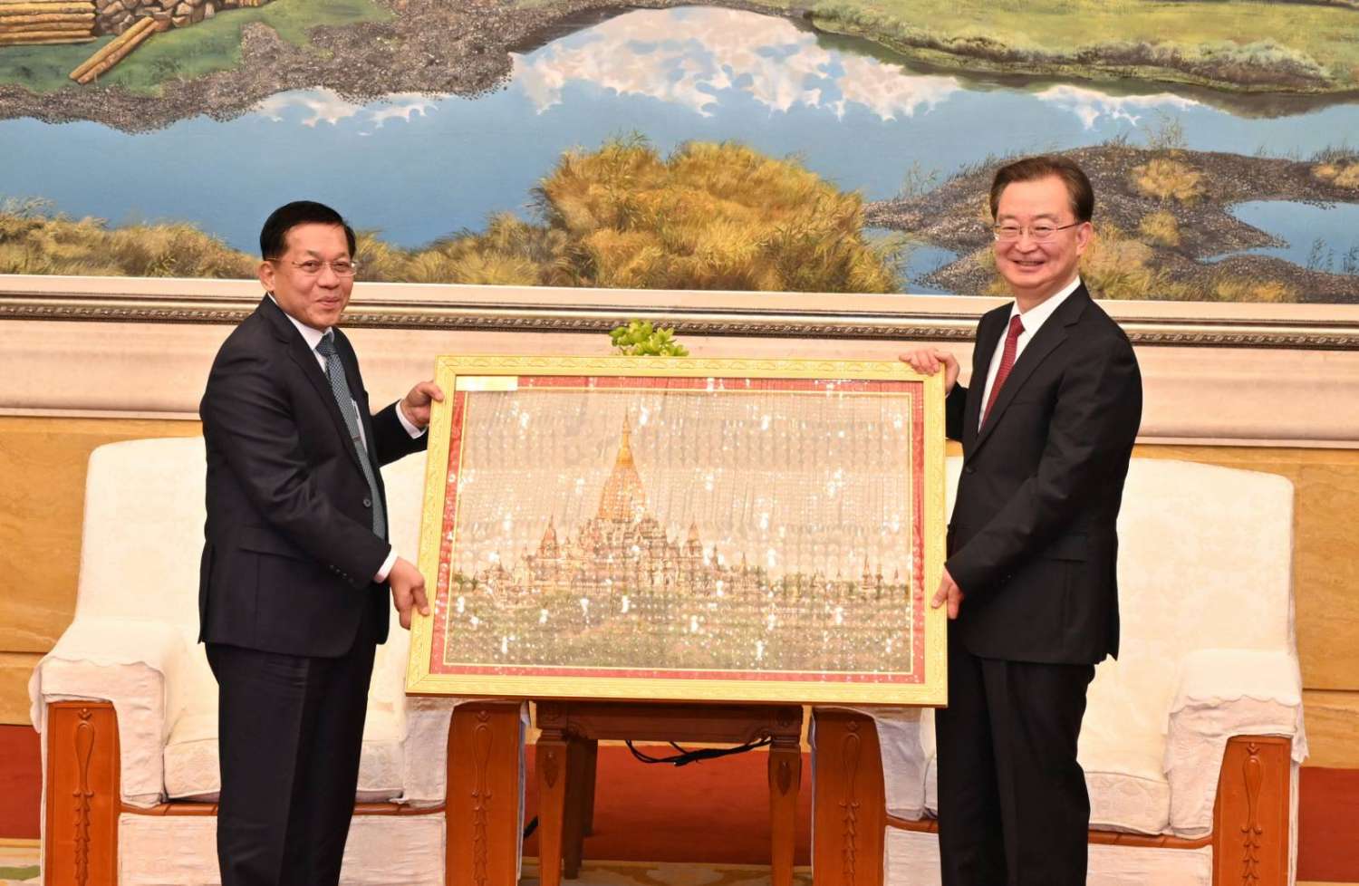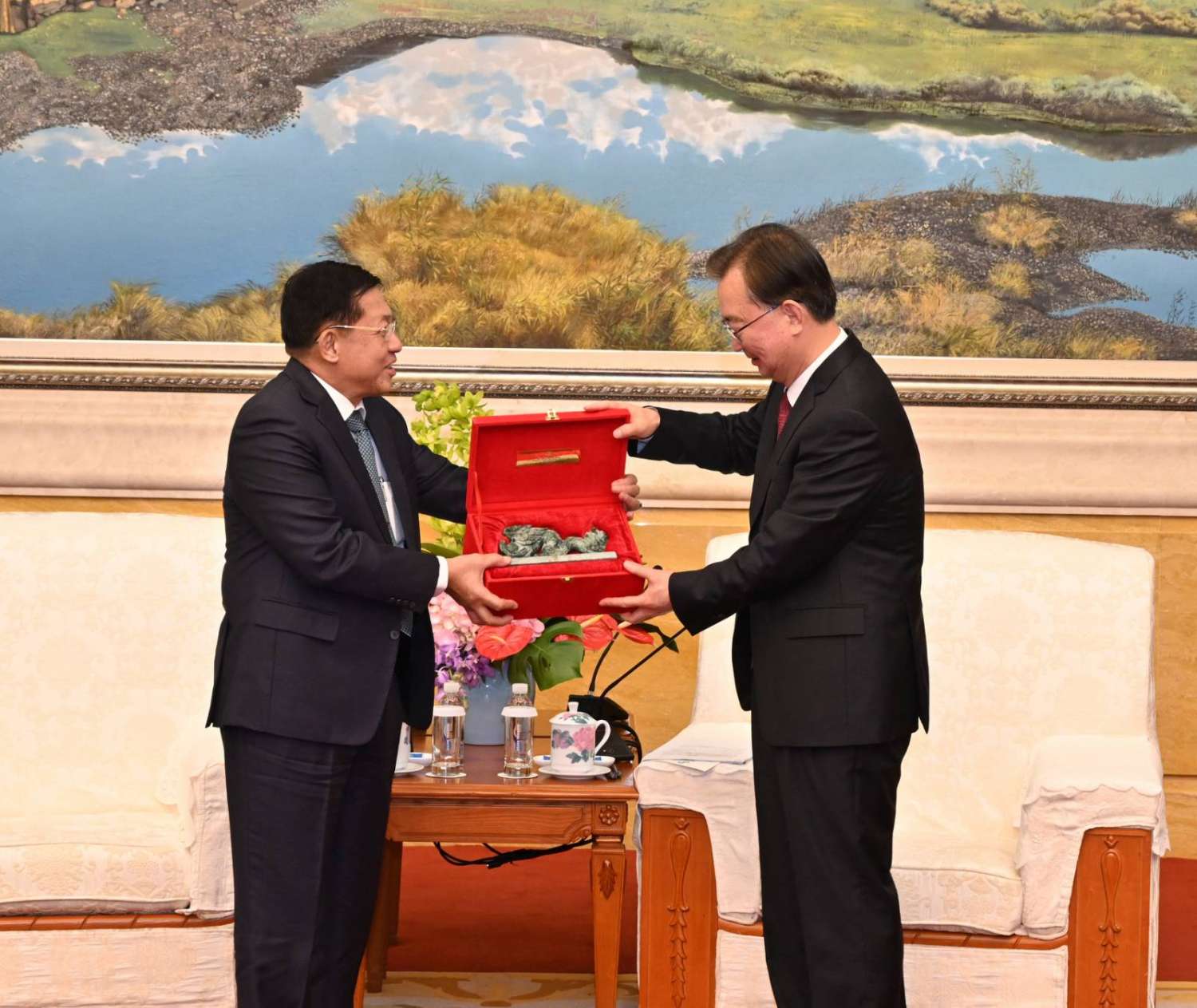 တွေ့ဆုံပွဲအပြီးတွင် နိုင်ငံတော်စီမံအုပ်ချုပ်ရေးကောင်စီဥက္ကဋ္ဌ နိုင်ငံတော်ဝန်ကြီးချုပ်နှင့်တရုတ်ကွန်မြူနစ်ပါတီ၊ ဗဟိုကော်မတီအဖွဲ့ဝင်နှင့် ယူနန်ပြည်နယ်ပါတီ ကော်မတီအတွင်းရေးမှူးတို့သည် အမှတ်တရလက်ဆောင်ပစ္စည်းများ အပြန်အလှန်ပေးအပ်ကြသည်။