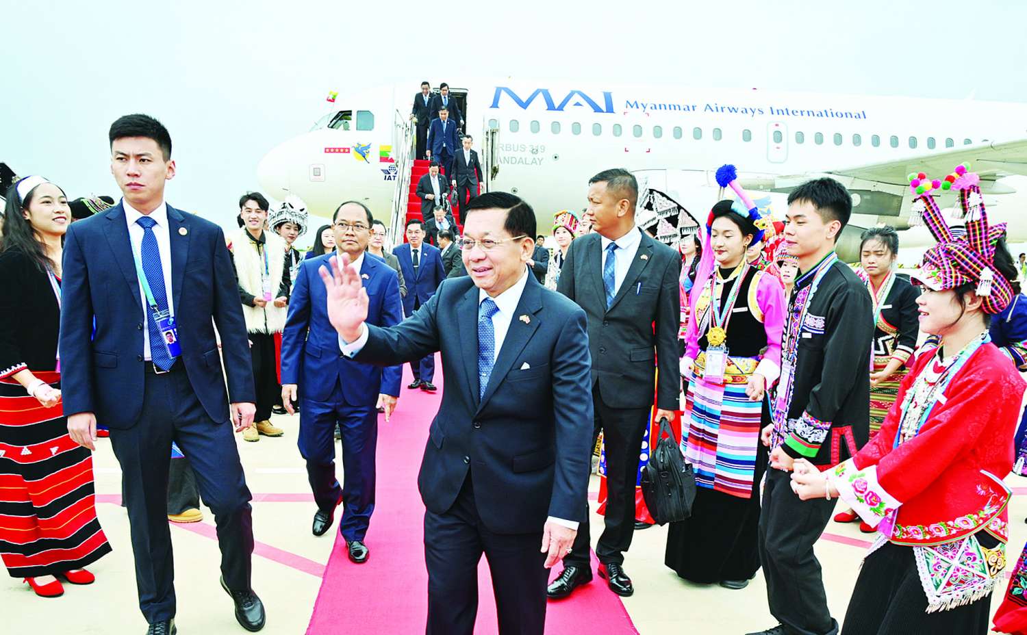 နိုင်ငံတော်စီမံအုပ်ချုပ်ရေးကောင်စီဥက္ကဋ္ဌ နိုင်ငံတော်ဝန်ကြီးချုပ် ဗိုလ်ချုပ်မှူးကြီး မင်းအောင်လှိုင် ဦးဆောင်သည့် မြန်မာအဆင့်မြင့်ကိုယ်စားလှယ်အဖွဲ့သည် တရုတ်ပြည်သူ့သမ္မတနိုင်ငံအစိုးရ၏ ဖိတ်ကြားချက်အရ အဋ္ဌမအကြိမ်မြောက် မဟာမဲခေါင်ဒေသခွဲထိပ်သီးအစည်းအဝေး 8th Greater Mekong Subregion(GMS) Summit ၊ (၁၀) ကြိမ်မြောက် ဧရာဝတီ-ကျောက်ဖရား- မဲခေါင် စီးပွားရေးပူးပေါင်းဆောင်ရွက်မှုမဟာဗျူဟာ ထိပ်သီးအစည်းအဝေး 10th Ayeyawady-Chao Phraya-Mekong Economic Cooperation Strategy (ACMECS) Summit နှင့် (၁၁)ကြိမ်မြောက် ကမ္ဘောဒီးယား - လာအို-မြန်မာ-ဗီယက်နမ် ပူးပေါင်းဆောင်ရွက်မှုထိပ်သီးအစည်းအဝေး 11th Cambodia-Lao PDR-Myanmar-Vietnam (CLMV) Summit တို့သို့ တက်ရောက်ရန်အတွက် ယနေ့နံနက်ပိုင်းတွင် အပြည်ပြည်ဆိုင်ရာ မြန်မာလေကြောင်း (MAI)မှ အထူးလေယာဉ်ဖြင့် နေပြည်တော်တပ်မတော်လေဆိပ်မှ ထွက်ခွာသည်။