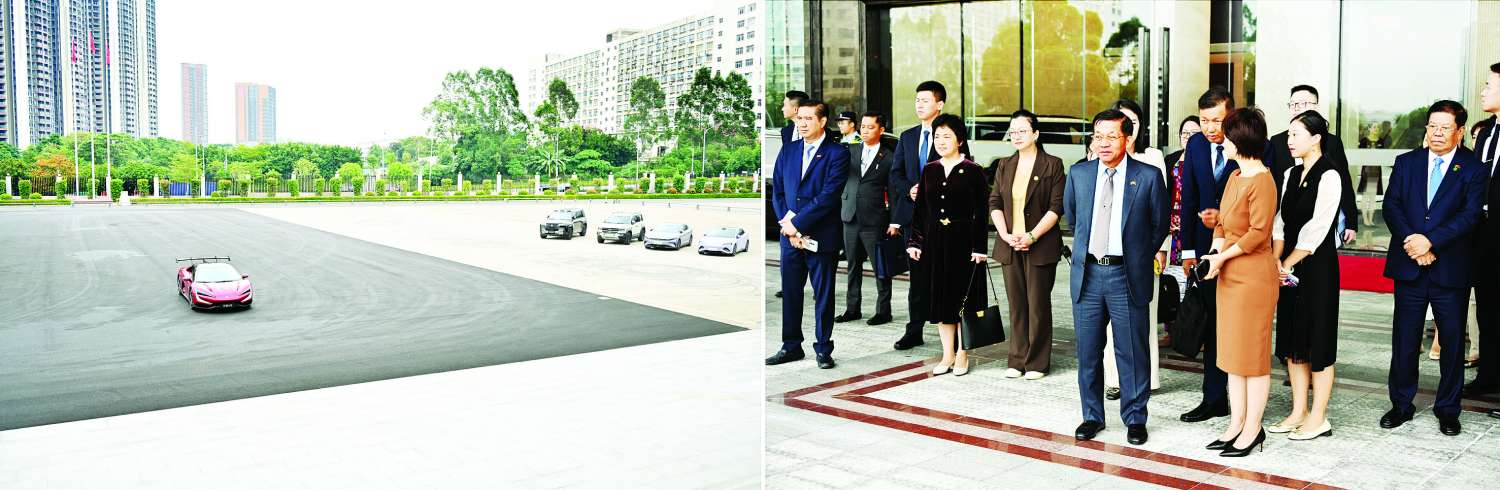 ယင်းနောက် ယနေ့နံနက်ပိုင်းတွင် နိုင်ငံတော်စီမံအုပ်ချုပ်ရေးကောင်စီဥက္ကဋ္ဌ နိုင်ငံတော်ဝန်ကြီးချုပ်နှင့် အဖွဲ့ဝင်များသည် ရှန်းကျန့်မြို့ရှိ BYD မော်တော်ကားထုတ်လုပ်ရေးကုမ္ပဏီသို့ ရောက်ရှိလေ့လာကြရာ ကုမ္ပဏီမှ Asia-Pacific Auto Sales Division Country Head of BYD Myanmar ဖြစ်သူ Mrs. Gillian Li နှင့် တာဝန်ရှိသူများက ကြိုဆိုနှုတ်ဆက်ကြပြီး ကုမ္ပဏီမှထုတ်လုပ်ထားသည့် BYD-U9 မော်ဒယ်ဖြင့် သရုပ်ပြသသည်။ ထို့နောက် ကုမ္ပဏီပြခန်းအတွင်း၌ ထုတ်လုပ်ထားသည့် ကားအမျိုးအစားများအား တစ်စီးချင်းစီအလိုက်ရှင်းလင်းပြသပြီး ကုမ္ပဏီသမိုင်းအကျဉ်းနှင့် လုပ်ငန်းဆောင်ရွက်နေမှုမှတ်တမ်းကို ဖွင့်လှစ်ပြသည်။