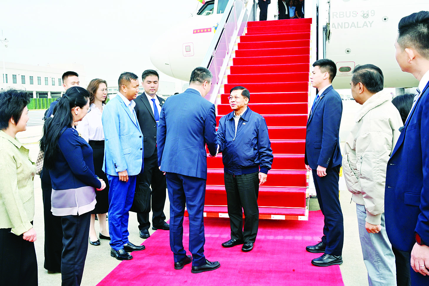 ထို့နောက် နိုင်ငံတော်စီမံအုပ်ချုပ်ရေးကောင်စီဥက္ကဋ္ဌ နိုင်ငံတော်ဝန်ကြီးချုပ်နှင့် အဖွဲ့ဝင်များသည် ရှန်းကျန့်မြို့၊ ဘောင်အန်းအပြည်ပြည်ဆိုင်ရာလေဆိပ်သို့ ရောက်ရှိကြရာ ရှန်းကျန့်မြို့ ဒုတိယမြို့တော်ဝန် Mr. Dai Jin Tao ၊ နန်နင်းမြို့မှ မြန်မာကောင်စစ်ဝန်ချုပ်ရုံး၊ ကောင်စစ်ဝန်ချုပ် ဒေါ်ခိုင်ဆုလင်းနှင့်တာဝန်ရှိသူများက လေဆိပ်၌ ကြိုဆိုပန်းစည်းဖြင့် လှိုက်လှဲနွေးထွေးစွာ ကြိုဆိုနှုတ်ဆက်ကြသည်။