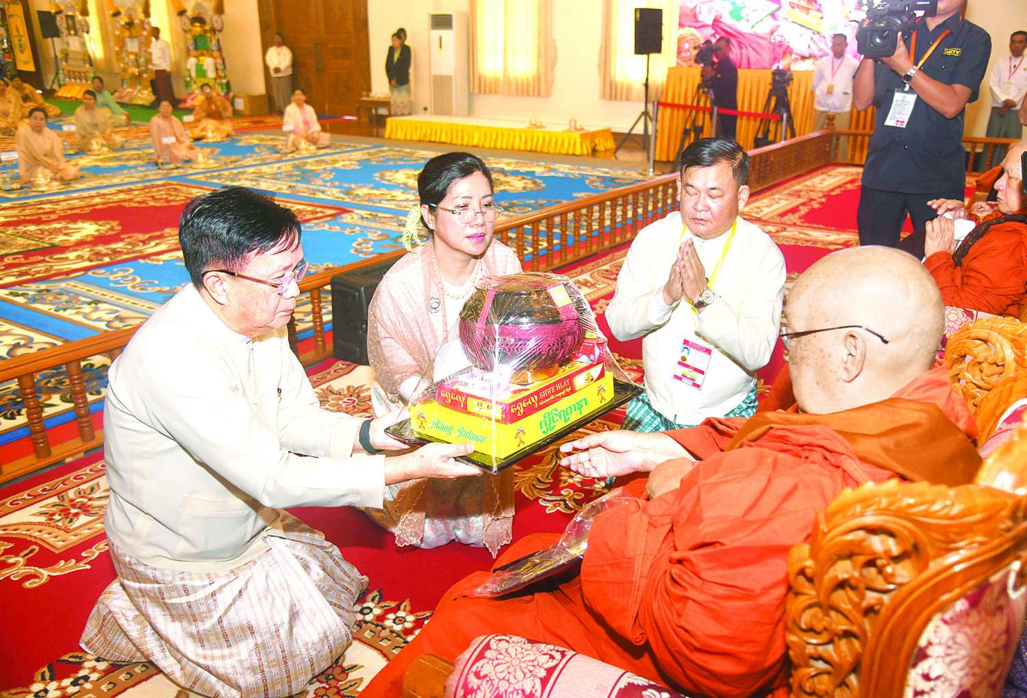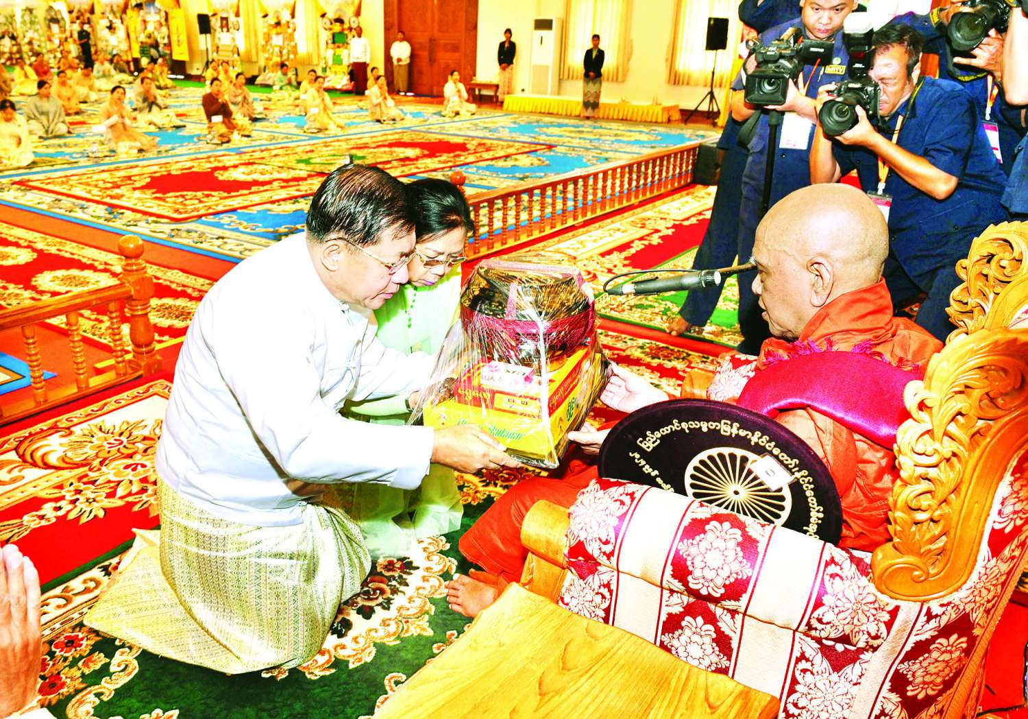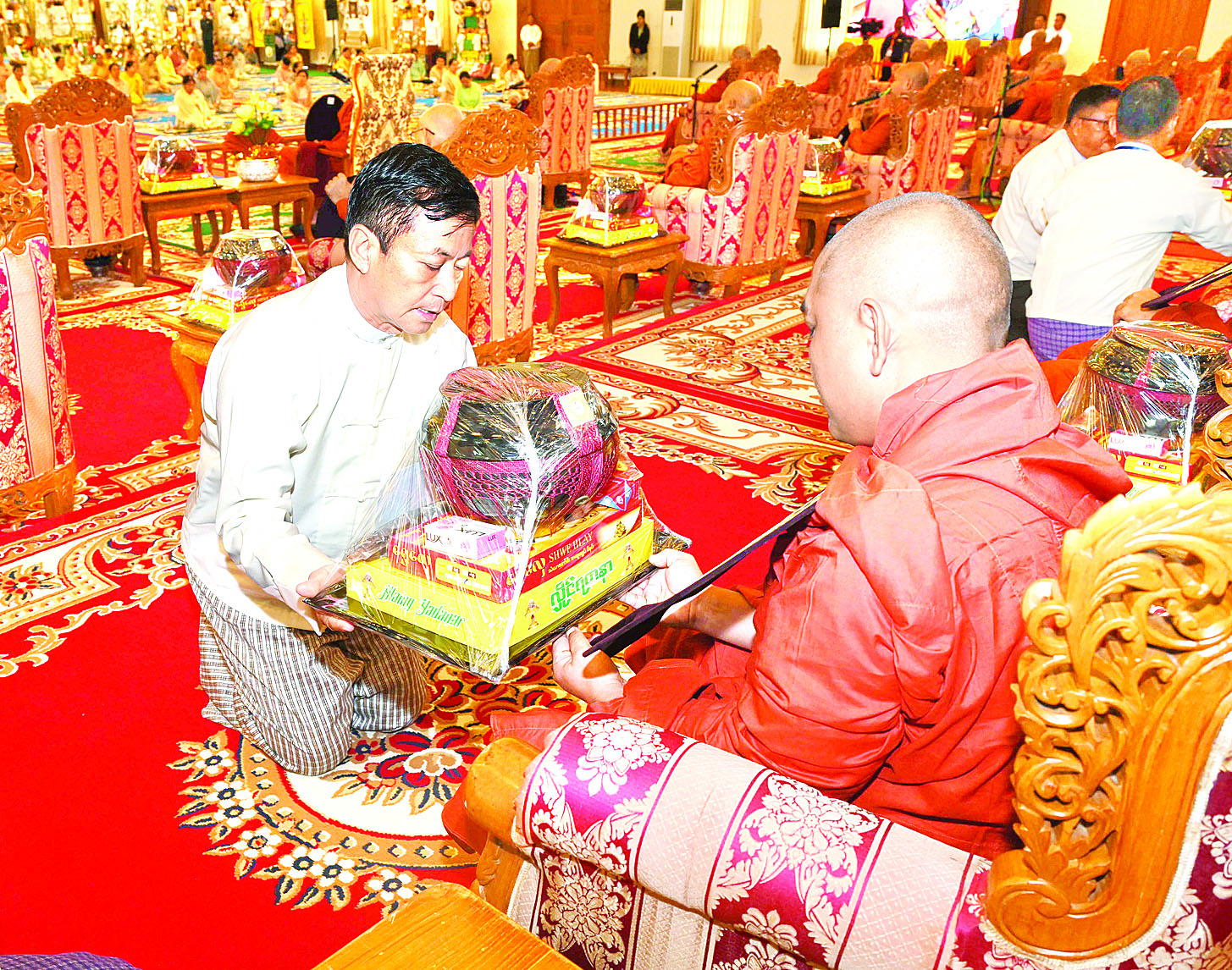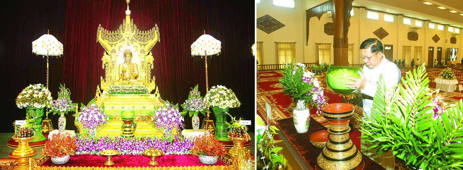 ဦးစွာ နိုင်ငံတော်စီမံအုပ်ချုပ်ရေးကောင်စီဥက္ကဋ္ဌ နိုင်ငံတော်ဝန်ကြီးချုပ်သည် သာသနာ့မဟာဗိမာန်တော်အတွင်းရှိ ဗုဒ္ဓရုပ်ပွားတော်မြတ်အား ဖူးမြော်ကြည်ညို၍ မြသပိတ်ဆွမ်းတော်၊ ပန်း၊ ရေချမ်း၊ ဆီမီးနှင့် သစ်သီးတို့ကို ဆက်ကပ်လှူဒါန်းသည်။