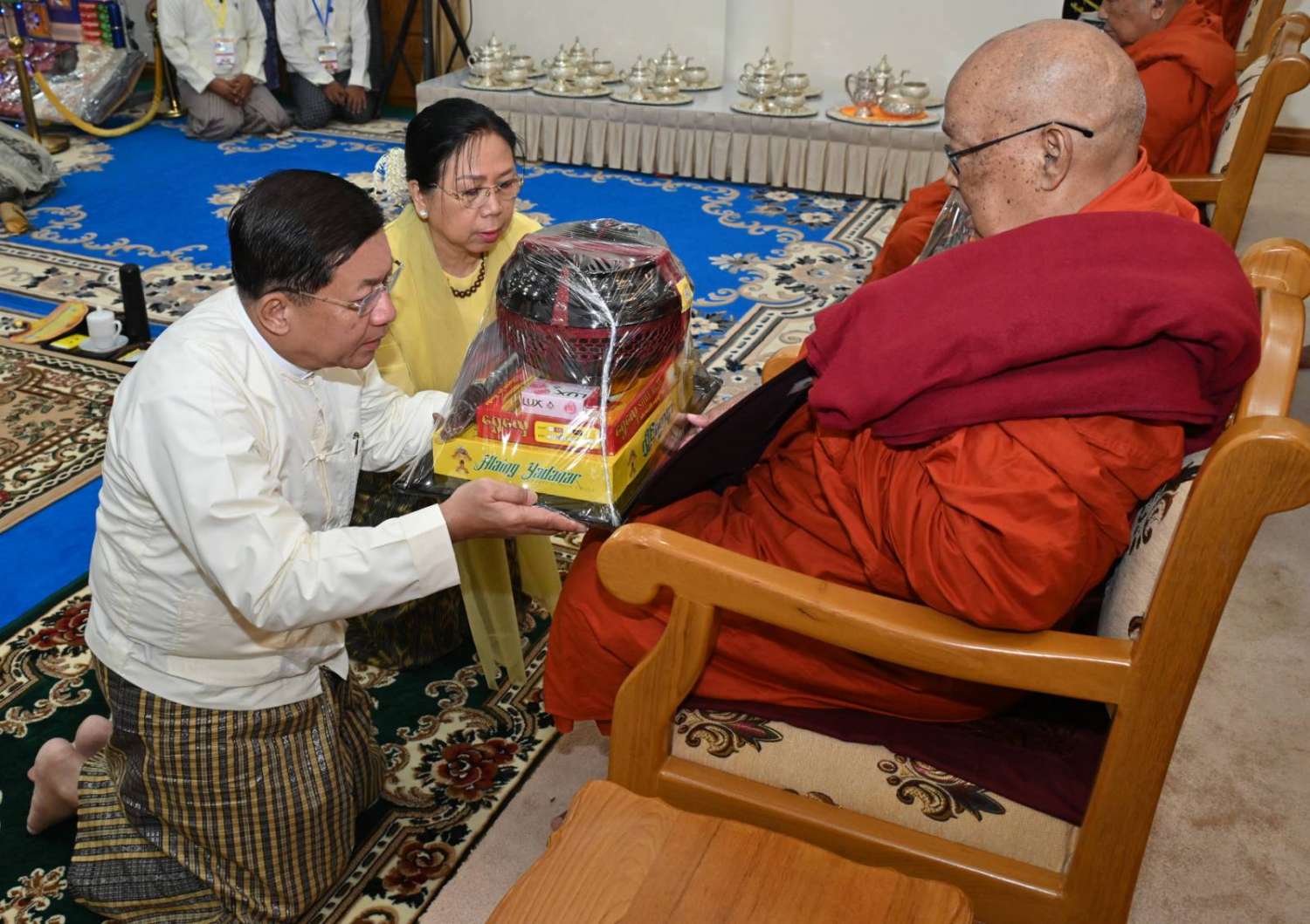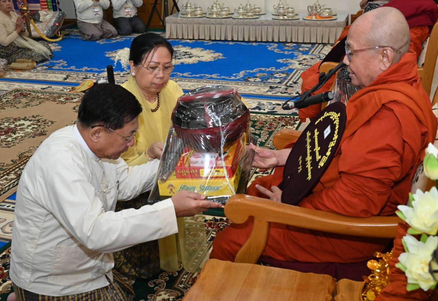 ဆက်လက်ပြီး ကောင်စီအတွင်းရေးမှူးနှင့်ဇနီး၊ တွဲဖက်အတွင်းရေးမှူးနှင့်ဇနီး၊ ကောင်စီဝင်များ၊ ပြည်ထောင်စုဝန်ကြီးများက ဆရာတော်၊ သံဃာတော်များထံ ကထိန်သင်္ကန်းနှင့် လှူဖွယ်ပစ္စည်းများကို အသီးသီးဆက်ကပ်လှူဒါန်းကြသည်။