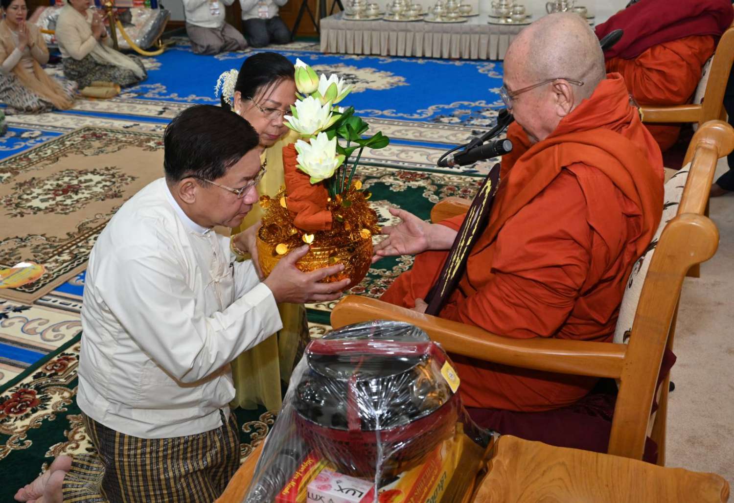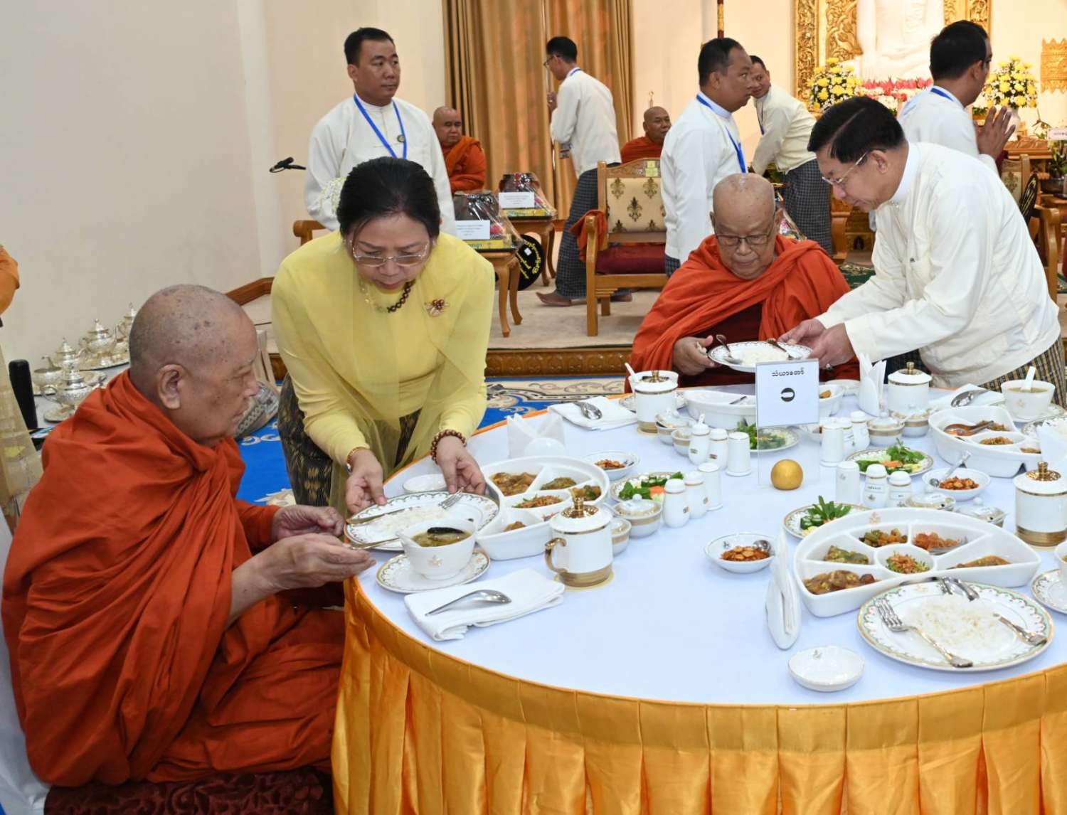 အခမ်းအနားသို့ လယ်ဝေးမြို့၊ ပေါက်မြိုင်ကျောင်းတိုက် ပဓာနနာယက အဘိဓဇ မဟာရဋ္ဌဂုရု ဘဒ္ဒန္တဇနိန္ဒ အမှူးပြုသည့် ဆရာတော်ကြီးများနှင့် မာရဝိဇယကျောင်းတော်တွင် သီတင်းသုံးတော်မူကြသည့် ဆရာတော်ကြီးများ ကြွရောက်ချီးမြှင့်တော်မူကြပြီး နိုင်ငံတော်စီမံအုပ်ချုပ်ရေးကောင်စီဥက္ကဋ္ဌ နိုင်ငံတော်ဝန်ကြီးချုပ် ဗိုလ်ချုပ်မှူးကြီး မင်းအောင်လှိုင်နှင့်ဇနီး ဒေါ်ကြူကြူလှတို့နှင့်အတူ နိုင်ငံတော်စီမံအုပ်ချုပ်ရေးကောင်စီ ဒုတိယဥက္ကဋ္ဌ၊ ဒုတိယဝန်ကြီးချုပ် ဒုတိယဗိုလ်ချုပ်မှူးကြီး စိုးဝင်းနှင့်ဇနီး ဒေါ်သန်းသန်းနွယ်၊ ကောင်စီအတွင်းရေးမှူးနှင့်ဇနီး၊ တွဲဖက်အတွင်းရေးမှူးနှင့်ဇနီး၊ ကောင်စီဝင်များနှင့်ဇနီးများ၊ ပြည်ထောင်စုဝန်ကြီးများနှင့် ဇနီးများ၊ နေပြည်တော်ကောင်စီဥက္ကဋ္ဌ၊ ကာကွယ်ရေးဦးစီးချုပ်ရုံးမှ အဆင့်မြင့်တပ်မတော်အရာရှိကြီးများနှင့်ဇနီးများ၊ နေပြည်တော်တိုင်းစစ်ဌာနချုပ်တိုင်းမှူးနှင့် တာဝန်ရှိသူများ တက်ရောက်ကြသည်။