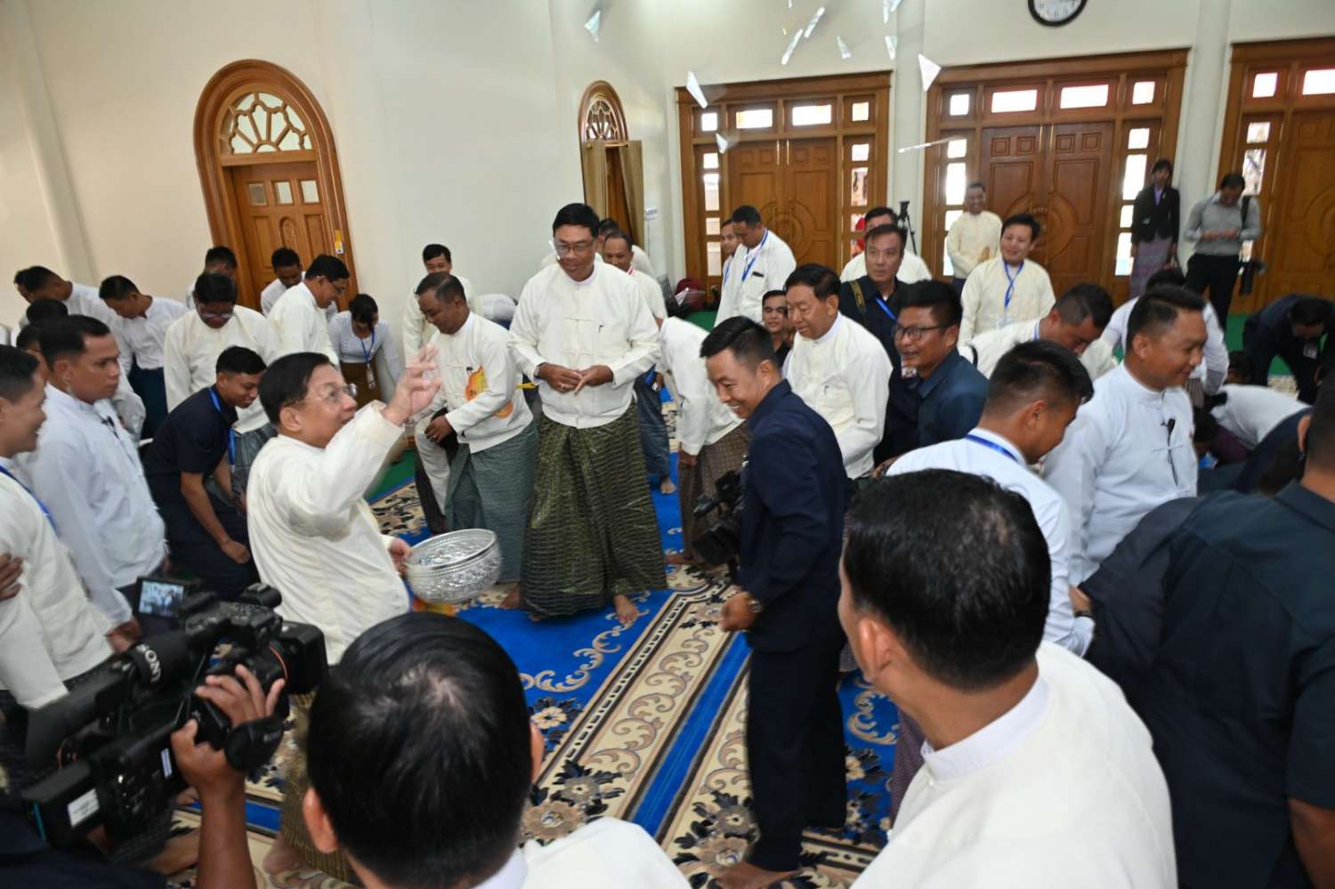 ယင်းနောက် အခမ်းအနားကို “နမော တဿ” သုံးကြိမ်ရွတ်ဆိုဘုရားကန်တော့ဖွင့်လှစ်ပြီး နိုင်ငံတော်စီမံအုပ်ချုပ်ရေးကောင်စီဥက္ကဋ္ဌ နိုင်ငံတော်ဝန်ကြီးချုပ်နှင့် အခမ်းအနား တက်ရောက်လာကြသည့် ဧည့်ပရိသတ်အပေါင်းတို့သည် မာရဝိဇယကျောင်းတော် ပဓာနနာယက အဂ္ဂမဟာပဏ္ဍိတ ဘဒ္ဒန္တ နေမိန္ဒ ထံမှ ငါးပါးသီလခံယူ ဆောက်တည်၍ သံဃာတော်အရှင်သူမြတ်များ ရွတ်ပွားသရဇ္ဈာယ်တော်မူသော မေတ္တသုတ် ပရိတ်တရားတော်များကိုနာယူကြသည်။