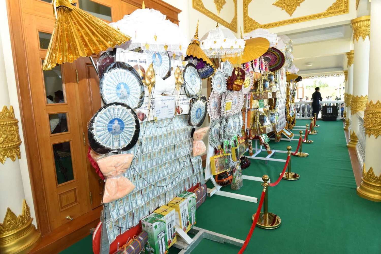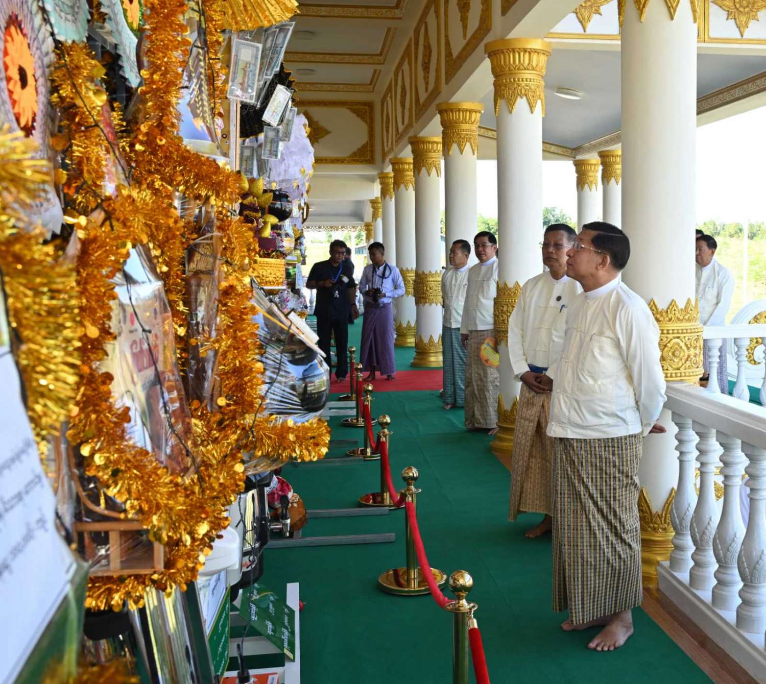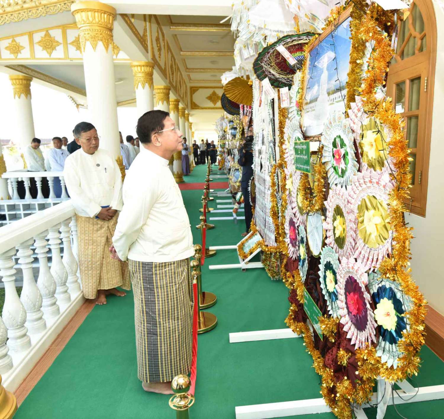 ထို့နောက် နိုင်ငံတော်စီမံအုပ်ချုပ်ရေးကောင်စီဥက္ကဋ္ဌ နိုင်ငံတော်ဝန်ကြီးချုပ်နှင့် အခမ်းအနား တက်ရောက်လာသည့် ဧည့်ပရိသတ်များသည် ကထိန်ခံ မာရဝိဇယ ကျောင်းတော်ကြီးသို့ လှူဒါန်းရန်ခင်းကျင်းပြင်ဆင်ထားသည့် ကထိန်လျာသင်္ကန်း၊ လှူဖွယ်ပစ္စည်းများနှင့် ပဒေသာပင်များအား လှည့်လည်ကြည့်ရှုကြသည်။