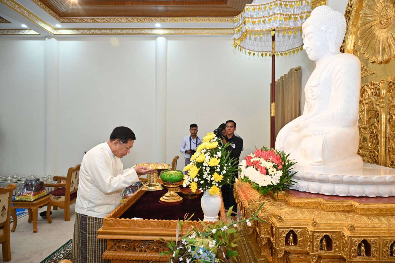 ဦးစွာ နိုင်ငံတော်စီမံအုပ်ချုပ်ရေးကောင်စီဥက္ကဋ္ဌ နိုင်ငံတော်ဝန်ကြီးချုပ်က မာရဝိဇယ ကျောင်းဆောင်တော်အတွင်းရှိ ဗုဒ္ဓရုပ်ပွားတော်မြတ်အား မြသပိတ်ဆွမ်းတော်၊ သစ်သီးနှင့် ပန်းမန်၊ သောက်တော်ရေချမ်းများ ကပ်လှူပူဇော်သည်။