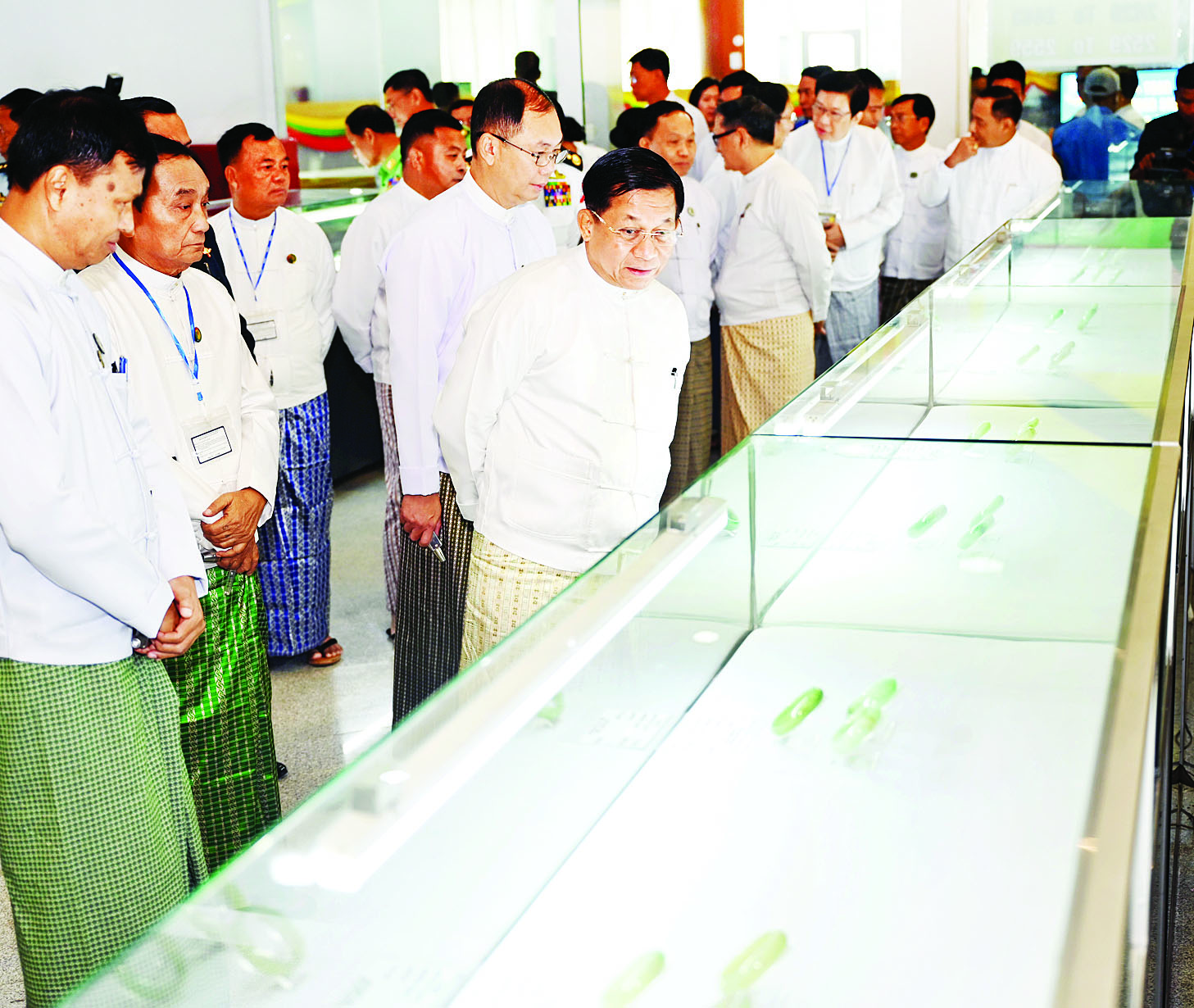 ယင်းနောက် နိုင်ငံတော်စီမံအုပ်ချုပ်ရေးကောင်စီဥက္ကဋ္ဌ နိုင်ငံတော်ဝန်ကြီးချုပ်နှင့် အခမ်းအနားတက်ရောက်လာကြသူများသည် ၂၀၂၄ ခုနှစ် နှစ်လယ်မြန်မာ့ကျောက်မျက်ရတနာပြပွဲ၌ ရောင်းချရန် မဏိရတနာကျောက်စိမ်းခန်းမအတွင်း ပြသထားသော ကျောက်စိမ်း၊ ကျောက်မျက်အတွဲများနှင့် ပုလဲအတွဲများကို လိုက်လံကြည့်ရှုစစ်ဆေးပြီး တာဝန်ရှိသူများ၏ ရှင်းလင်းတင်ပြမှုအပေါ် နိုင်ငံတော်စီမံအုပ်ချုပ်ရေးကောင်စီဥက္ကဋ္ဌ နိုင်ငံတော်ဝန်ကြီးချုပ်က လိုအပ်သည်များ လမ်းညွှန်မှာကြားသည်။