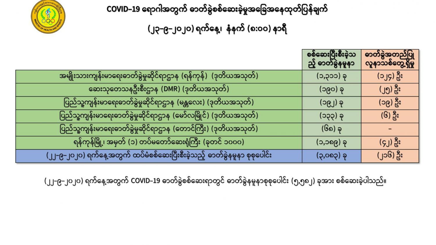 စုစုပေါင်း (၅,၅၈၂) ခုအား စစ်ဆေးခဲ့ခြင်းဖြစ်ပြီး COVID-19 ရောဂါ ဓာတ်ခွဲအတည်ပြုလူနာ သစ် (၄၈၉) ဦး တွေ့ရှိခဲ့ပါသည်။ (ဓာတ်ခွဲအတည်ပြုလူနာသစ် (၂၇၃) ဦး တွေ့ရှိကြောင်းကို (၂၂-၉-၂၀၂၀) ရက်နေ့၊ ည (၈:၀၀) နာရီသတင်းတွင် ထုတ်ပြန်ပြီးဖြစ်ပါသည်။)