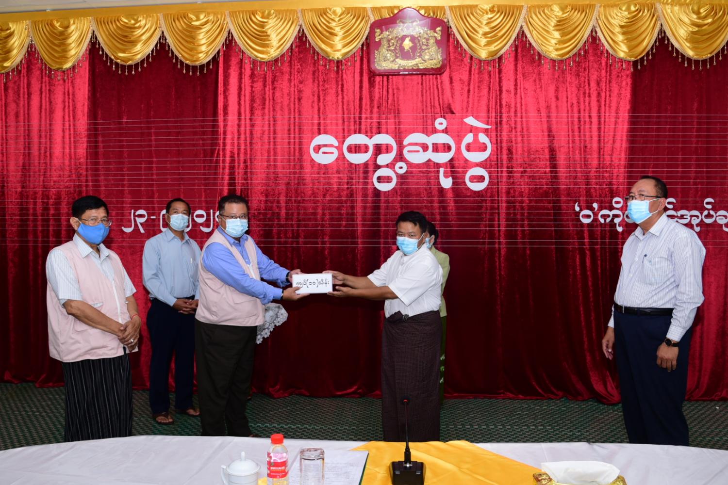 ဆက်လက်၍ ရှမ်းပြည်နယ်အစိုးရအဖွဲ့ ပြည်နယ်ဝန်ကြီးချုပ် ဒေါက်တာလင်းထွဋ်သည် ဟိုပန်မြို့နယ် Covid-19 ထိန်းချုပ်ရေးနှင့် အရေးပေါ်တုံ့ပြန်ရေးကော်မတီသို့ ထောက်ပံ့ငွေကျပ်(၁၀)သိန်းနှင့် ကျန်းမာရေးသုံး ပစ္စည်းဖြစ်သည့် mask(၂၅၀၀)ခုပေးအပ်ရာ မြို့နယ်ကိုဗစ်-၁၉ ကော်မတီ ဥက္ကဋ္ဌ ဦးမင်းသူ မှ လက်ခံရယူ ပြီး ဗမာတိုင်းသားလူမျိုးရေးရာဝန် ကြီးဒေါက်တာအောင်သန်းမောင် က COVID-19 ရောဂါဖြစ်ပွားနေသည့် ကာလ အတွင်း အသက်(၈၀)နှင့်(၈၅)နှစ်အတွင်းရှိ ဘိုး/ဘွား(၆၂)ဦးအတွက် ထောက်ပံ့ငွေများ ပေးအပ်ရာ ခရိုင်လူမှု ဝန်ထမ်းဦးစီးမှူး ဒေါ်ဖြိုးဖြိုးသက် မှ လက်ခံရယူပြီးနောက် ပြည်နယ်ဝန်ကြီးချုပ် ဒေါက်တာလင်းထွဋ် က နိဂုံးချုပ် အမှာစကားပြောကြားခဲ့ကြောင်း သိရသည်။