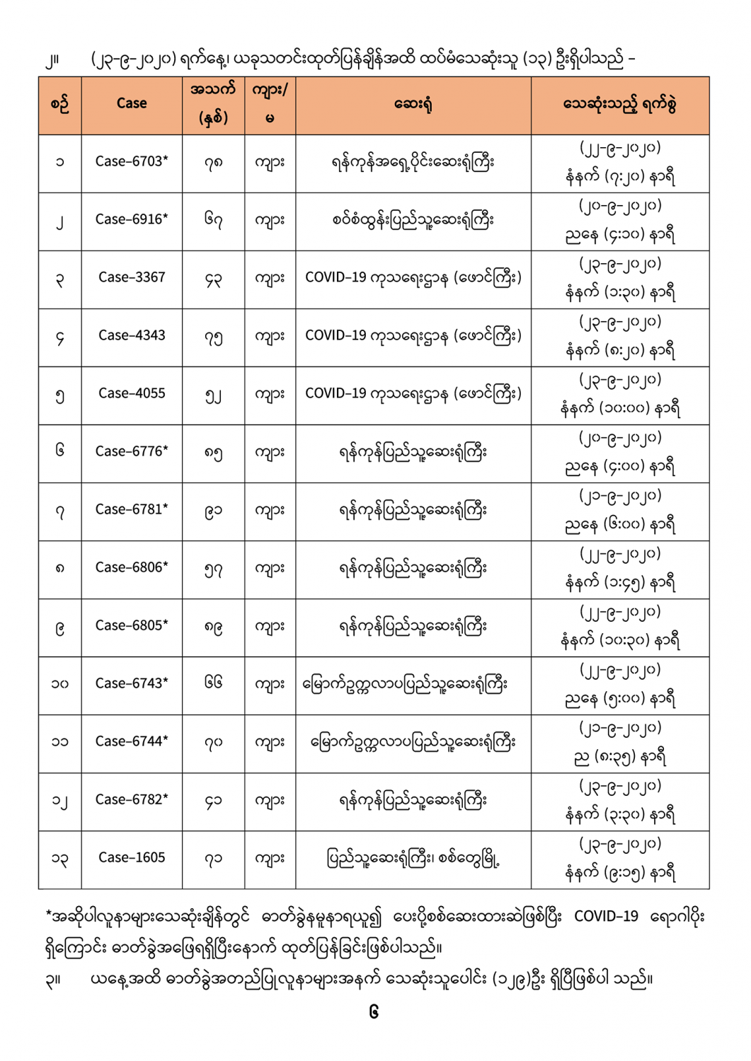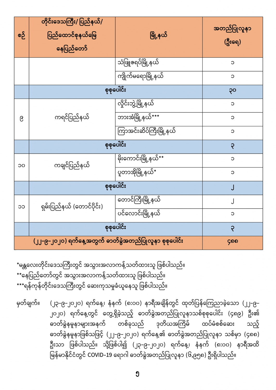 ၁။ (၂၂-၉-၂၀၂၀) ရက်နေ့တွင် ဓာတ်ခွဲစစ်ဆေးတွေ့ရှိခဲ့သည့် COVID-19 လူနာသစ် (၄၈၈) ဦး၏ မြို့နယ်အလိုက် တွေ့ရှိရမှု အခြေအနေမှာ အောက်ပါအတိုင်း ဖြစ်ပါသည်။