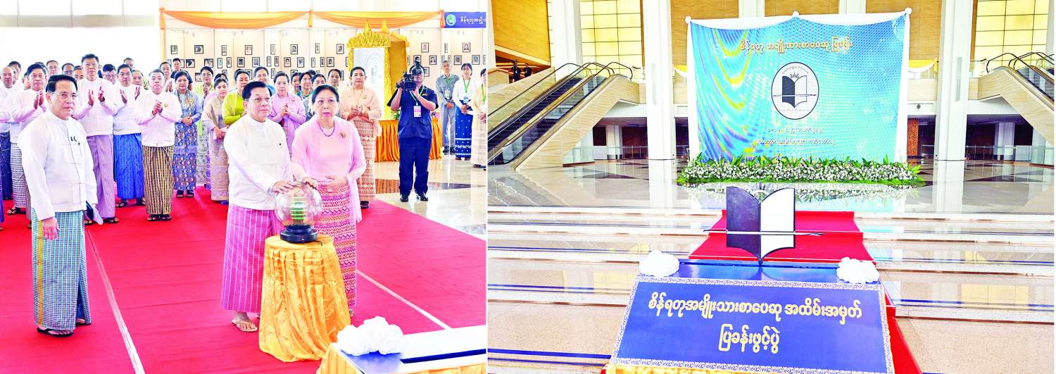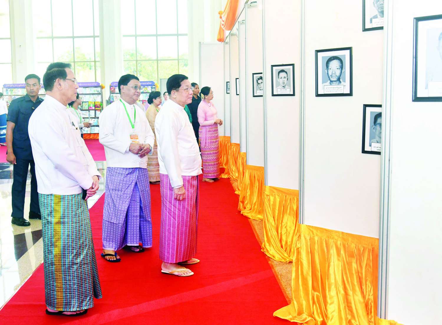 ဦးစွာ နိုင်ငံတော်စီမံအုပ်ချုပ်ရေးကောင်စီဥက္ကဋ္ဌ နိုင်ငံတော်ဝန်ကြီးချုပ်နှင့် ဇနီးတို့က စိန်ရတုအမျိုးသားစာပေဆုအထိမ်းအမှတ်ပြခန်းအား စက်ခလုတ်နှိပ်ဖွင့်လှစ်ပေးသည်။