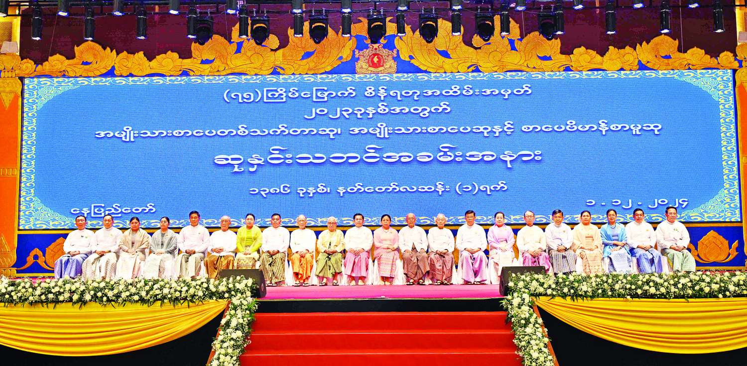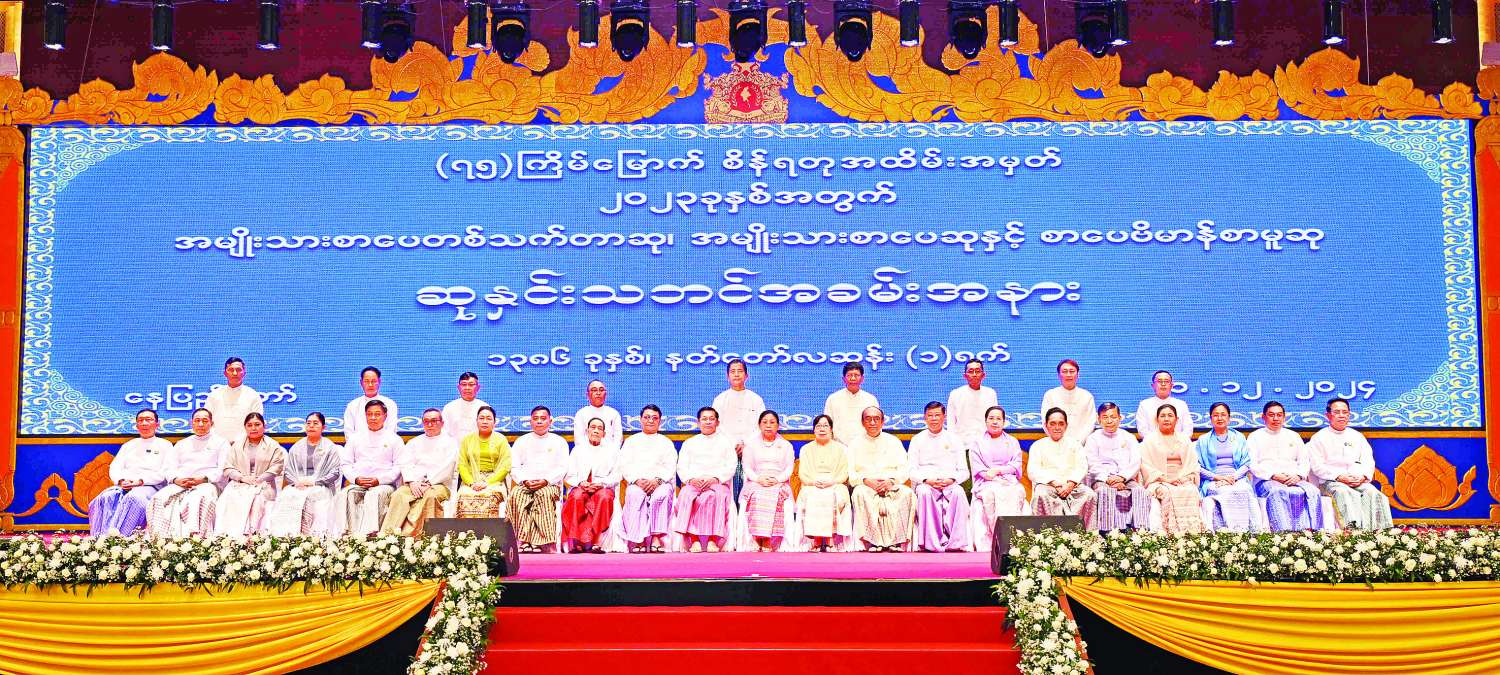 (၇၅) ကြိမ်မြောက် စိန်ရတုအမျိုးသားစာပေဆုအထိမ်းအမှတ် ၂ဝ၂၃ ခုနှစ်အတွက် အမျိုးသားစာပေတစ်သက်တာဆု၊ အမျိုးသားစာပေဆုနှင့် စာပေဗိမာန်စာမူဆု ဆုနှင်းသဘင်အခမ်းအနားကျင်းပ နိုင်ငံတော်စီမံအုပ်ချုပ်ရေးကောင်စီဥက္ကဋ္ဌ နိုင်ငံတော်ဝန်ကြီးချုပ် ဗိုလ်ချုပ်မှူးကြီး မင်းအောင်လှိုင်နှင့် ဇနီး ဒေါ်ကြူကြူလှ တက်ရောက်ချီးမြှင့်ပေးအပ်