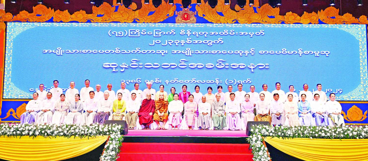 ယင်းနောက် နိုင်ငံတော်စီမံအုပ်ချုပ်ရေးကောင်စီဥက္ကဋ္ဌ နိုင်ငံတော်ဝန်ကြီးချုပ်နှင့် ဇနီးနှင့် အခမ်းအနားတက်ရောက်လာကြသူများသည် ၂၀၂၃ ခုနှစ်အတွက် အမျိုးသားစာပေတစ်သက်တာဆု၊ အမျိုးသားစာပေဆုနှင့် စာပေဗိမာန်စာမူဆုရရှိကြသူများနှင့်အတူ မှတ်တမ်းတင်ဓာတ်ပုံရိုက်ကြသည်။