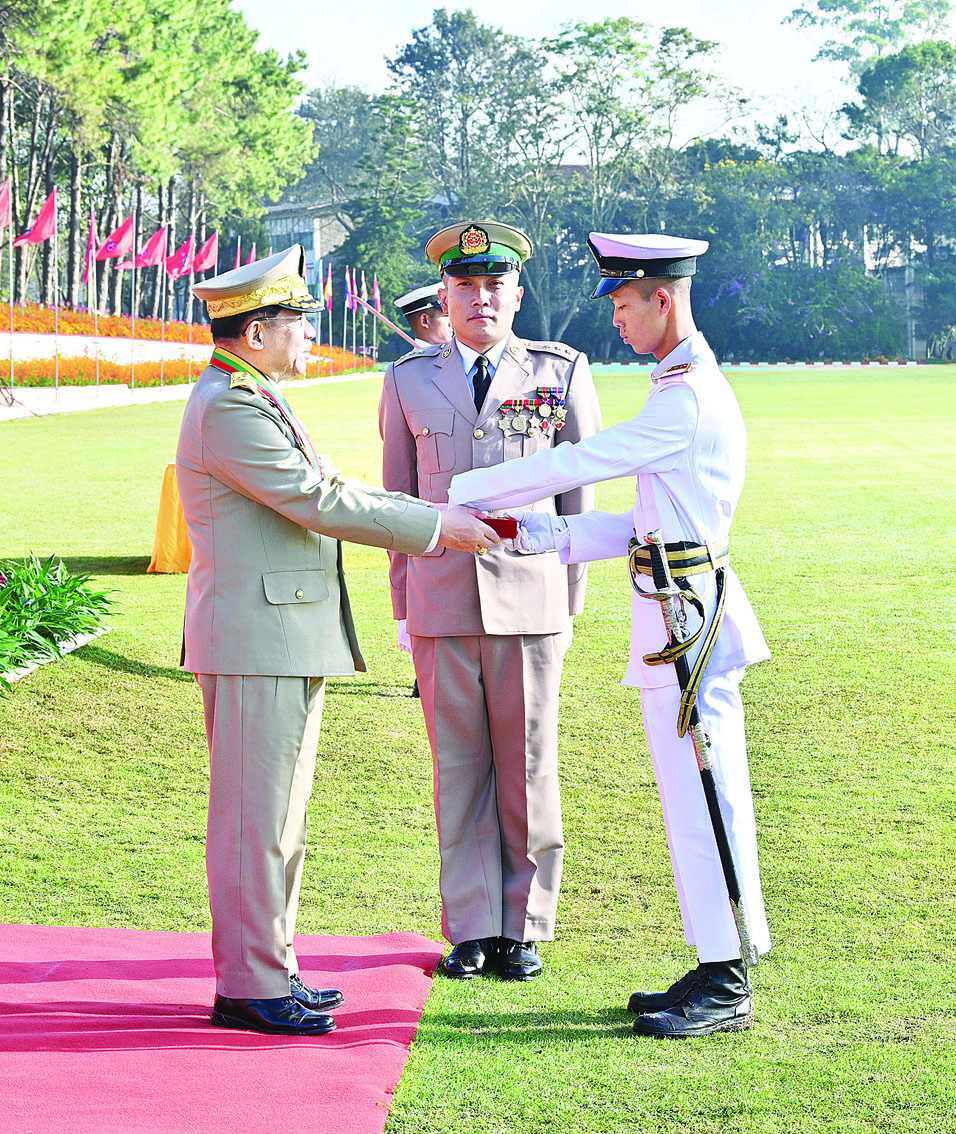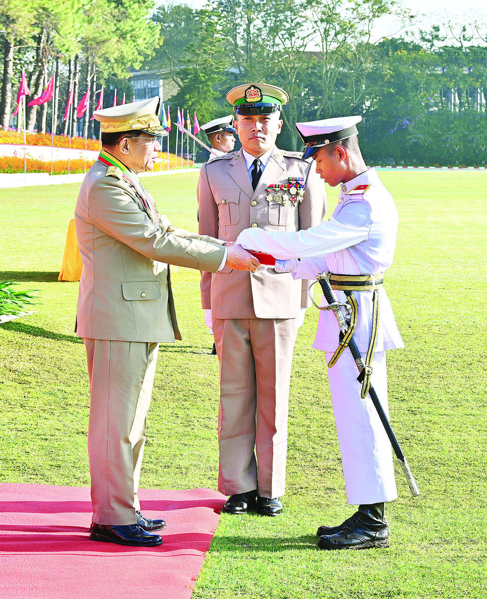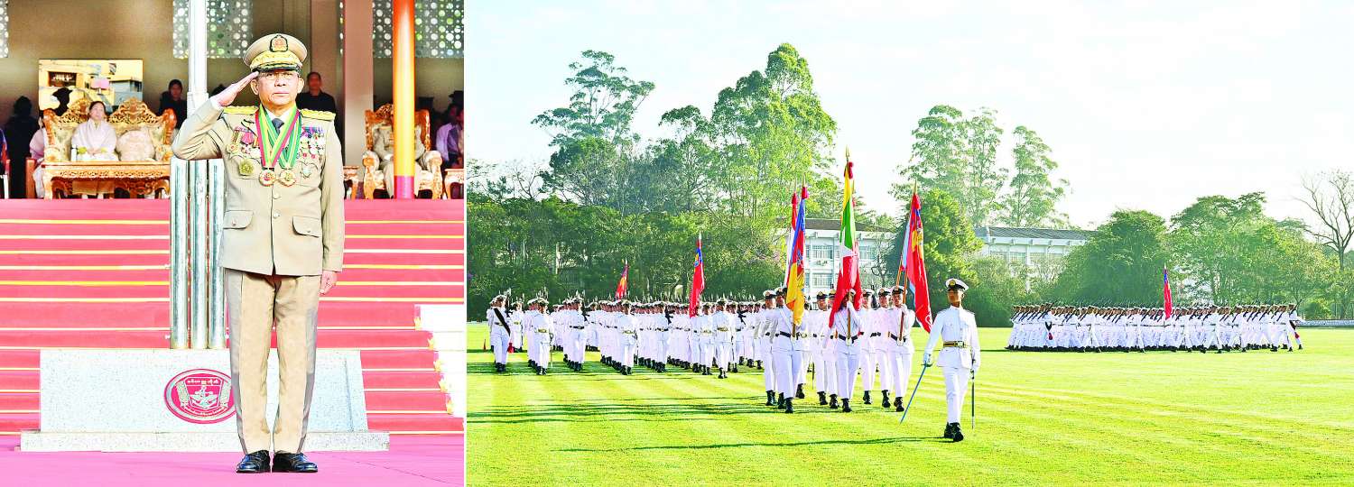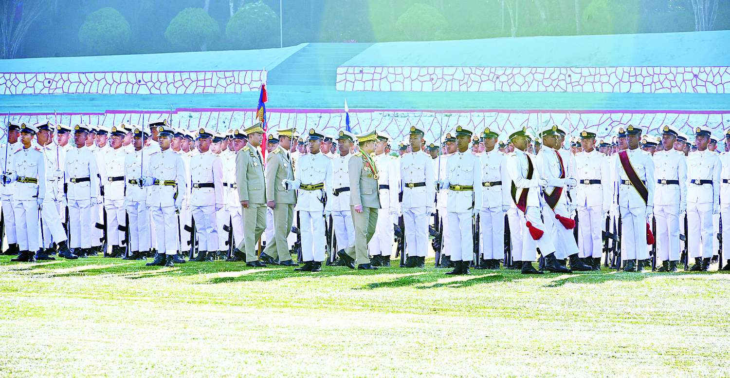 စစ်တက္ကသိုလ် ဗိုလ်လောင်းသင်တန်းအမှတ်စဉ်(၆၆) သင်တန်းဆင်းဂုဏ်ပြု စစ်ရေးပြအခမ်းအနားကို ယနေ့နံနက်ပိုင်းတွင် ပြင်ဦးလွင်မြို့၊ စစ်တက္ကသိုလ်စစ်ရေးပြကွင်း၌ ကျင်းပပြုလုပ်ရာ နိုင်ငံတော်စီမံအုပ်ချုပ်ရေးကောင်စီဥက္ကဋ္ဌ တပ်မတော်ကာကွယ်ရေးဦးစီးချုပ် ဗိုလ်ချုပ်မှူးကြီး သတိုးမဟာသရေစည်သူ သတိုးသီရိသုဓမ္မ မင်းအောင်လှိုင် တက်ရောက်မိန့်ခွန်း ပြောကြားသည်။