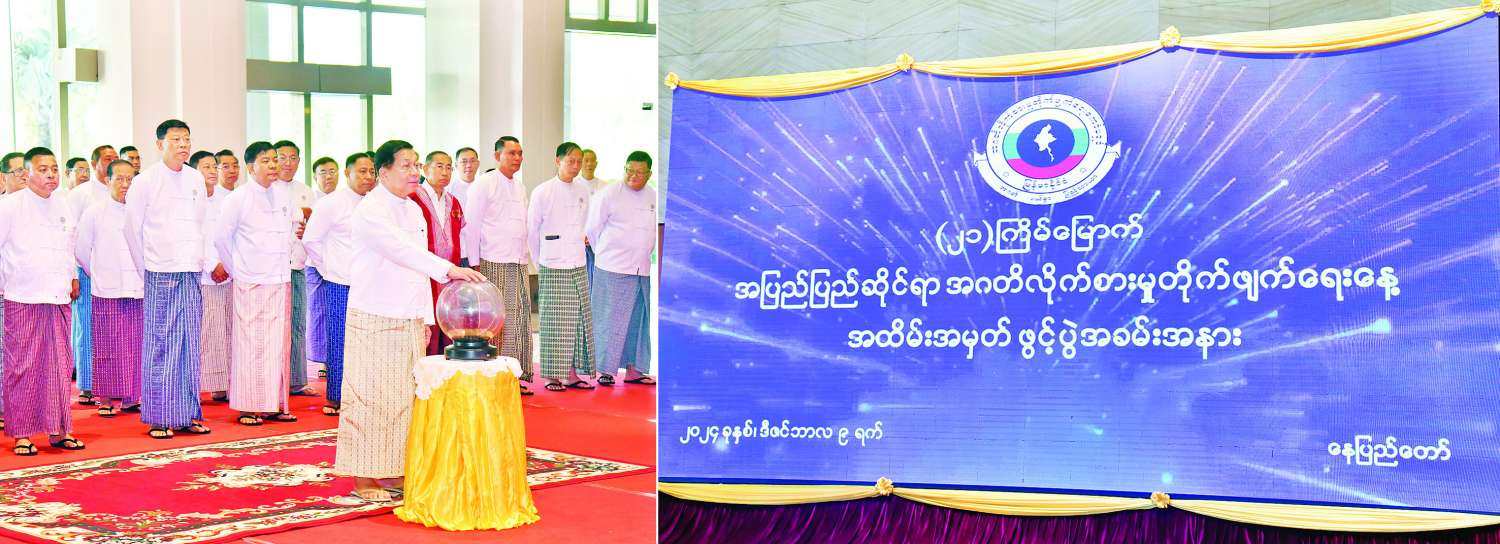 ဦးစွာ နိုင်ငံတော်စီမံအုပ်ချုပ်ရေးကောင်စီဥက္ကဋ္ဌ နိုင်ငံတော်ဝန်ကြီးချုပ်က အပြည်ပြည်ဆိုင်ရာ အဂတိလိုက်စားမှုတိုက်ဖျက်ရေးနေ့အထိမ်းအမှတ် အခမ်းအနား ဖွင့်ပွဲဆိုင်းဘုတ်ကို စက်ခလုတ်နှိပ်ဖွင့်လှစ်ပေးသည်။