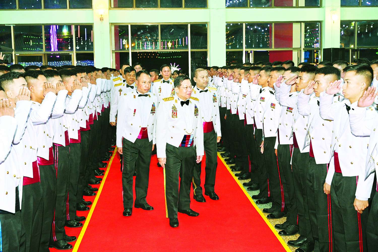 ဦးစွာ နိုင်ငံတော်စီမံအုပ်ချုပ်ရေးကောင်စီဥက္ကဋ္ဌ တပ်မတော်ကာကွယ်ရေးဦးစီးချုပ်က သင်တန်းဆင်းအရာရှိများအား တစ်ဦးချင်း ရင်းရင်းနှီးနှီးလိုက်လံနှုတ်ဆက်သည်။ ထို့နောက် နိုင်ငံတော်စီမံအုပ်ချုပ်ရေးကောင်စီဥက္ကဋ္ဌ တပ်မတော်ကာကွယ်ရေးဦးစီးချုပ်နှင့် အဖွဲ့ဝင်များသည် သင်တန်းဆင်းအရာရှိများ၊ ညစာစားပွဲတက်ရောက်လာကြသူများနှင့်အတူ ဂုဏ်ပြုညစာကို အတူတကွသုံးဆောင်ကြသည်။