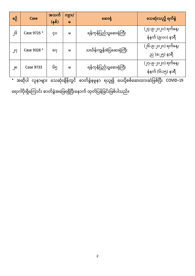 ၂။ (၂၇-၉-၂၀၂၀) ရက်နေ့၊ ည (၈:၀၀)နာရီအထိ မြန်မာနိုင်ငံတွင် COVID-19 ရောဂါဓာတ်ခွဲ အတည်ပြုလူနာ (၁၀,၇၃၄) ဦးရှိပြီ ဖြစ်ပါသည်။