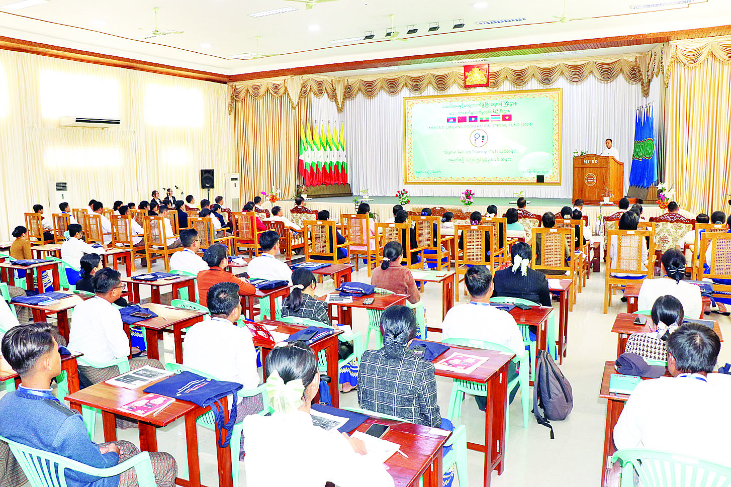 သမဝါယမနှင့်ကျေးလက်ဖွံ့ဖြိုးရေးဝန်ကြီးဌာန အသေးစားစက်မှုလက်မှုလုပ်ငန်းဦးစီးဌာန၏ ဒစ်ဂျစ်တယ်နည်းပညာဆိုင်ရာ အသိပညာနှင့် ကျွမ်းကျင်မှုမြှင့်တင်ခြင်း “Digital Skill Up Training (TOT)” သင်တန်းအမှတ်စဉ် (၁/၂၀၂၅) ကို ယနေ့နံနက်ပိုင်းတွင် အဆိုပါဝန်ကြီးဌာနစုပေါင်းခန်းမ၌ ကျင်းပရာ ပြည်ထောင်စုဝန်ကြီး ဦးလှမိုး၊ အမြဲတမ်းအတွင်းဝန်၊ ဌာနဆိုင်ရာအကြီးအကဲများ၊ နည်းပြများ၊ တိုင်းဒေသကြီးနှင့် ပြည်နယ်များမှ သင်တန်းသား သင်တန်းသူများ၊ ဖိတ်ကြားထားသော ဧည့်သည်တော်များနှင့် တာဝန်ရှိသူများ တက်ရောက်ကြသည်။