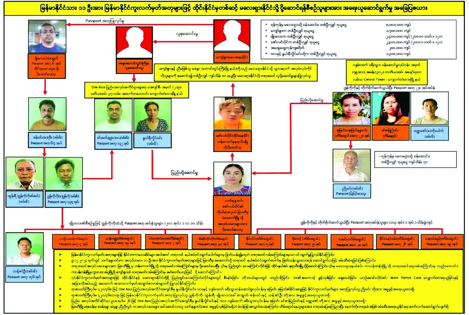 မြန်မာနိုင်ငံရဲတပ်ဖွဲ့၊ သတင်းရဲတပ်ဖွဲ့က ပြစ်မှုကျူးလွန်သူများကို စုံစမ်းဖော်ထုတ်ခဲ့ရာ One Asia အလုပ်အကိုင်ရှာဖွေရေးအေဂျင်စီမှ နွယ်နီလှိုင်မင်း၊ ဗလ၊ လျမ်းထက်ခရီးသွား ဝန်ဆောင်မှုလုပ်ငန်းမှ ဝဏ္ဏဇော် (ခေါ်)ကိုပေါက်၊ နိုင်ငံကူးလက်မှတ်အတုပြုလုပ်သူများဖြစ်သည့် ကမာရွတ်မြို့နယ် အမှတ်(၃)ရပ်ကွက် စေတနာသုခလမ်း အမှတ်(၇၂/ ၃ လွှာ-စီ)နေညိုမင်း၊ လှိုင်မြို့နယ်၊ အမှတ်(၁၆)ရပ်ကွက် မာလာမြိုင်(၉)လမ်း၊ အမှတ်(၁၁/ ၅ လွှာ-ယာ)နေ ဂျွန်ကိုကို (ခေါ်)ဂျွန်ကိုနှင့် ၎င်း၏ဖခင်ဖြစ်သူ ထွန်းရီ၊ မြန်မာနိုင်ငံကူးလက်မှတ် အတုများကို ဂျွန်ကိုကိုထံ အပ်နှံပြုလုပ်၍ အလုပ်သမားများကို မလေးရှားနိုင်ငံသို့ တရားမဝင်ပို့ဆောင်ပေးသူများ ဖြစ်သည့် ပန်းဘဲတန်းမြို့နယ် အမှတ်(၈)ရပ်ကွက် လမ်း(၃၀/အထက်) အမှတ်(၂၀၀)နေ စန်းဝင်း(ခေါ်)ရဖီးနှင့် ဒဂုံမြို့သစ်(မြောက်ပိုင်း) မြို့နယ် အမှတ်(၄)ရပ်ကွက် ဘုရင့်နောင်လမ်းနှင့် ဗထူးလမ်းသွယ်ထောင့် အမှတ်(၁)နေ သန့်ဇင်ဦးတို့ ရှစ်ဦးကို ဖမ်းဆီးရမိခဲ့သည်။
