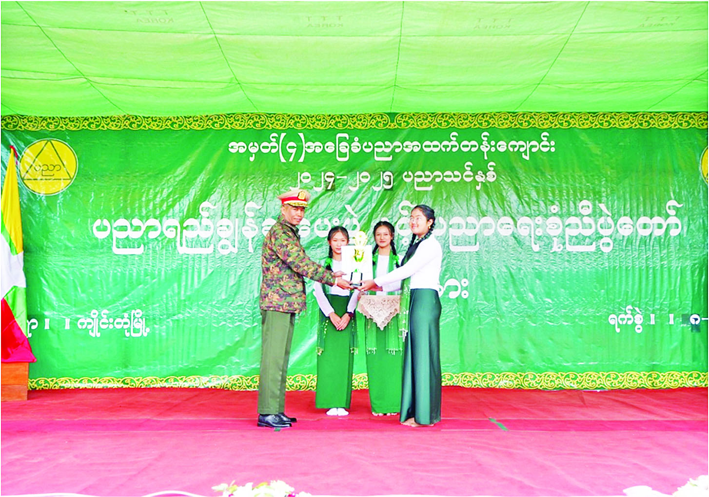 ၂၀၂၄-၂၀၂၅ ပညာသင်နှစ် ပညာရည်ချွန်ဆုပေးပွဲနှင့် ပညာရေးစုံညီပွဲတော်ကို ယနေ့နံနက်ပိုင်းတွင် ရှမ်းပြည်နယ် (အရှေ့ပိုင်း) ကျိုင်းတုံမြို့ရှိ အမှတ် (၄) အခြေခံပညာအထက်တန်းကျောင်း၌ ကျင်းပရာ တြိဂံဒေသတိုင်းစစ်ဌာနချုပ် တိုင်းမှူး ဗိုလ်မှူးချုပ် စိုးလှိုင်နှင့် အဖွဲ့ဝင်များ၊ ပြည်နယ်၊ ခရိုင်၊ မြို့နယ်အဆင့် ဌာနဆိုင်ရာ တာဝန်ရှိသူများ၊ ဆရာ ဆရာမများ၊ ကျောင်းသား ကျောင်းသူများ၊ ကျောင်းသား မိဘများနှင့် ဖိတ်ကြားထားသူများ တက်ရောက်ကြသည်။