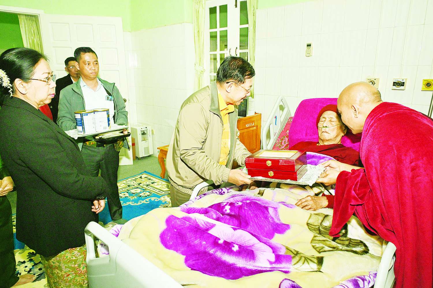 ဦးစွာ နိုင်ငံတော်စီမံအုပ်ချုပ်ရေးကောင်စီဥက္ကဋ္ဌ နိုင်ငံတော်ဝန်ကြီးချုပ်နှင့်ဇနီး၊ အဖွဲ့ဝင်များသည် ဆရာတော်ကြီးအား ဖူးမြော်ကြည်ညို၍ ဆရာတော်ကြီးအား ကျန်းမာရေးစစ်ဆေးပေးထားမှုများနှင့် လိုအပ်သည့်ကျန်းမာရေးစောင့်ရှောက်မှု ဆောင်ရွက်ပေးထားသည့်အခြေအနေများကို ကြည့်ရှုမေးမြန်းရာ တာဝန်ရှိသူများက ဆရာတော်ကြီး၏ ကျန်းမာရေးအခြေအနေများကို ရှင်းလင်းတင်ပြသည်။ တင်ပြမှုများအပေါ် နိုင်ငံတော်စီမံအုပ်ချုပ်ရေးကောင်စီဥက္ကဋ္ဌ နိုင်ငံတော်ဝန်ကြီးချုပ်က ဆရာတော်ကြီး၏ ကျန်းမာရေးစောင့်ရှောက်မှုလုပ်ငန်းများ ဆောင်ရွက်ရာတွင် အခြေအနေများကို မပြတ်စောင့်ကြည့်၍ လိုအပ်သည်များကို အချိန်နှင့်တစ်ပြေးညီ ဖြည့်ဆည်းဆောင်ရွက်ပေးရန်နှင့် အခြားလိုအပ်သည်များကို အလေးထားမှာကြားသည်။