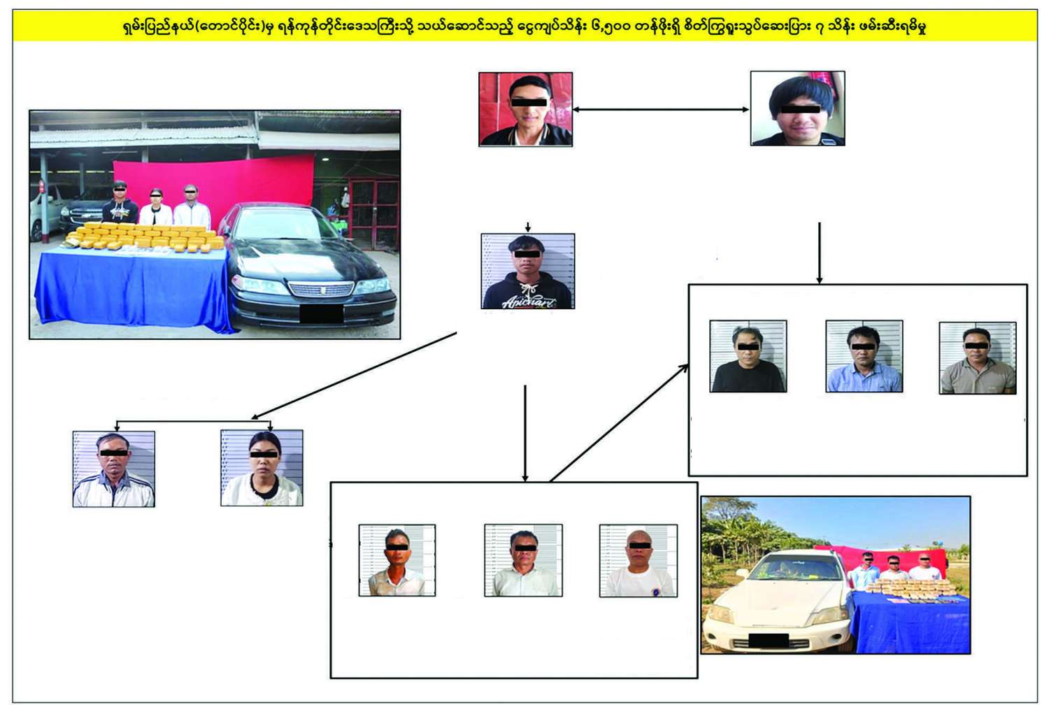 ဆက်လက်၍ ရန်ကုန်မြို့တွင် စိတ်ကြွရူးသွပ်ဆေးပြားများလက်ခံ၍ ပြန်လည်ရောင်းချသူများဖြစ်သည့် အောင်ကျော်ဌေး (ခ) ကိုဌေးနှင့် စိုင်းဝေအောင်တို့အား သင်္ဃန်းကျွန်းမြို့နယ်၌လည်းကောင်း၊ ဦးဦးသန့်ဇော်အား တာမွေမြို့နယ်၌လည်းကောင်း အသီးသီးဆက်လက်ဖော်ထုတ်ဖမ်းဆီးရမိခဲ့ကြောင်း သိရှိရသဖြင့် ၎င်းတို့အား ဥပဒေအရ အရေးယူထားရှိပြီး ကွင်းဆက်ပြစ်မှုကျူးလွန်သူများအား ဆက်လက်စစ်ဆေး ဖော်ထုတ်လျက်ရှိကြောင်း မြန်မာနိုင်ငံရဲတပ်ဖွဲ့မှ သတင်းရရှိသည်။
