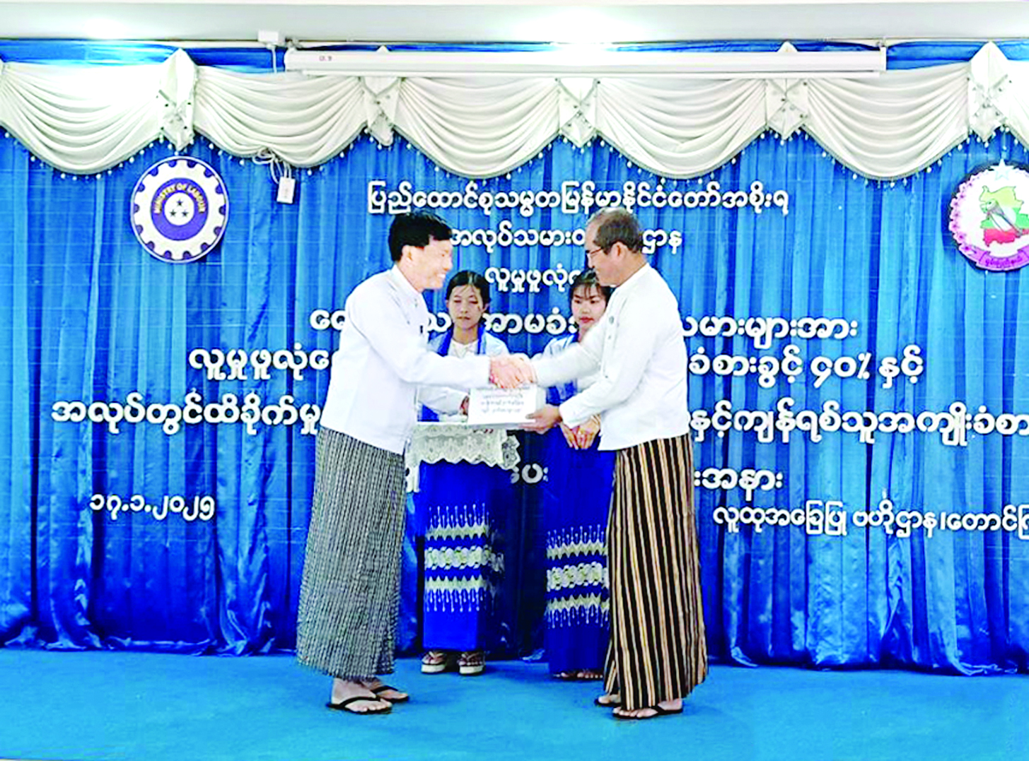 ရေဘေးသင့် အာမခံအလုပ်သမားများအား လူမှုဖူလုံရေးကူညီမှု အကျိုးခံစားခွင့် ၄၀ ရာခိုင်နှုန်း ခွင့်ပြုထုတ်ပေးခြင်းနှင့် အလုပ်ခွင်ထိခိုက်မှုကြောင့် အမြဲတမ်းမသန်စွမ်းမှုအကျိုးခံစားခွင့်ပေးအပ်ပွဲ အခမ်းအနားကို ယနေ့နံနက်ပိုင်းတွင် ရှမ်းပြည်နယ် တောင်ကြီးမြို့ လူထုအခြေပြုစုပေါင်းခန်းမ၌ ကျင်းပရာ အလုပ်သမားဝန်ကြီးဌာန ဒုတိယဝန်ကြီး ဦးဝင်းရှိန်နှင့် ရှမ်းပြည်နယ်ဝန်ကြီးများ၊ အလုပ်သမားဝန်ကြီးဌာနမှ တာဝန်ရှိသူများနှင့် စက်ရုံ၊ အလုပ်ရုံ၊ အလုပ်ဌာနများမှ အလုပ်ရှင်ကိုယ်စားလှယ်များ၊ အလုပ်သမား ကိုယ်စားလှယ်များ တက်ရောက်ကြသည်။
