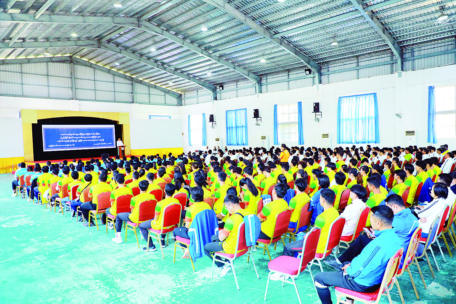 အားကစားနှင့်လူငယ်ရေးရာဝန်ကြီးဌာန ပြည်ထောင်စုဝန်ကြီး ဦးမင်းသိန်းဇံနှင့် (၃၃) ကြိမ်မြောက် အရှေ့တောင်အာရှ အားကစားပြိုင်ပွဲအတွက် စခန်းဝင်လေ့ကျင့်လျက်ရှိသည့် နည်းပြများ၊ အားကစားသမားများတွေ့ဆုံပွဲကို ယနေ့နံနက်ပိုင်းတွင် နေပြည်တော်အားကစားလေ့ကျင့်ရေးစခန်း Gold Camp ရှိ Gold Medal Hall ၌ ကျင်းပသည်။