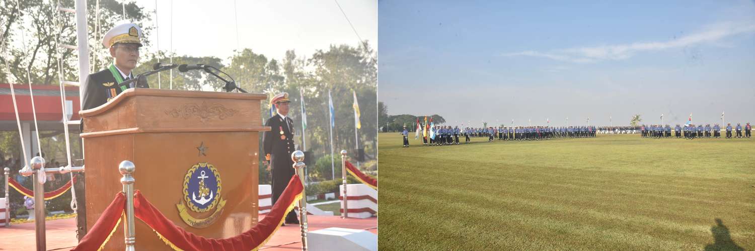 တပ်မတော်(ရေ) အရာရှိငယ်(စီမံခန့်ခွဲရေး)သင်တန်းအမှတ်စဉ်(၈၄)နှင့် တပ်မတော်(ရေ) အရာရှိငယ်(အင်ဂျင်နီယာ)သင်တန်းအမှတ်စဉ်(၅၈) သင်တန်းဆင်းဂုဏ်ပြုစစ်ရေးပြ အခမ်းအနားကို ယနေ့နံနက်ပိုင်းတွင် သန်လျင်တပ်နယ်ရှိ ရေတပ်လေ့ကျင့်ရေးဌာနချုပ် စစ်ရေးပြကွင်း၌ကျင်းပရာ နိုင်ငံတော်စီမံအုပ်ချုပ်ရေးကောင်စီဥက္ကဋ္ဌ တပ်မတော်ကာကွယ်ရေးဦးစီးချုပ်ကိုယ်စား ကာကွယ်ရေးဦးစီးချုပ်(ရေ) ဗိုလ်ချုပ်ကြီး ထိန်ဝင်း တက်ရောက်မိန့်ခွန်းပြောကြားသည်။