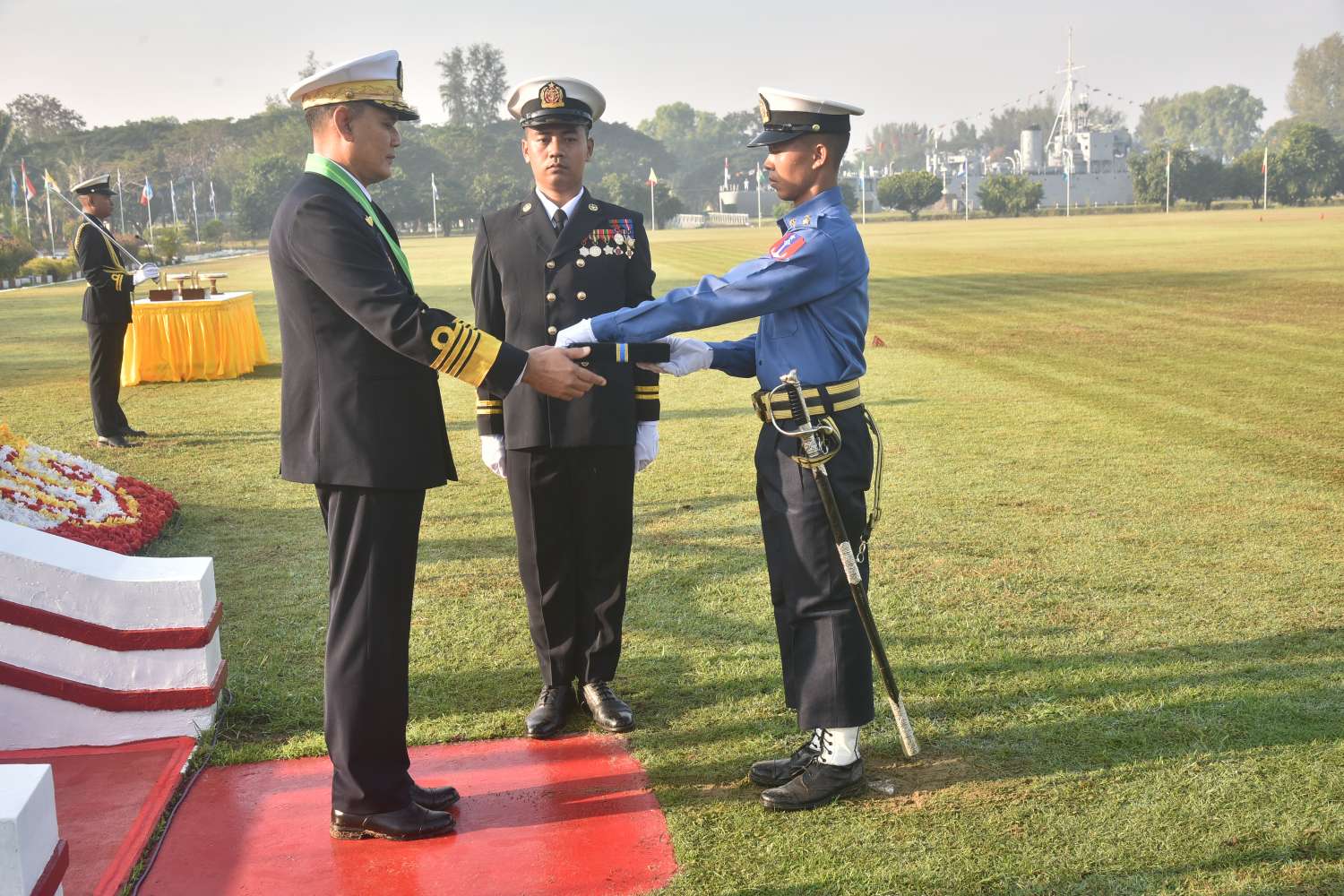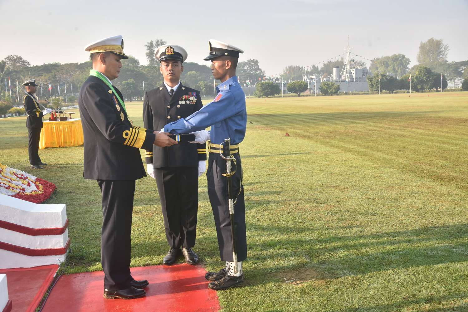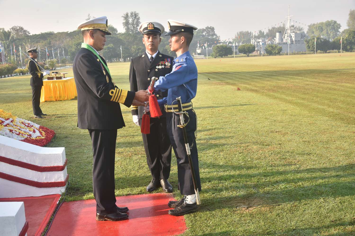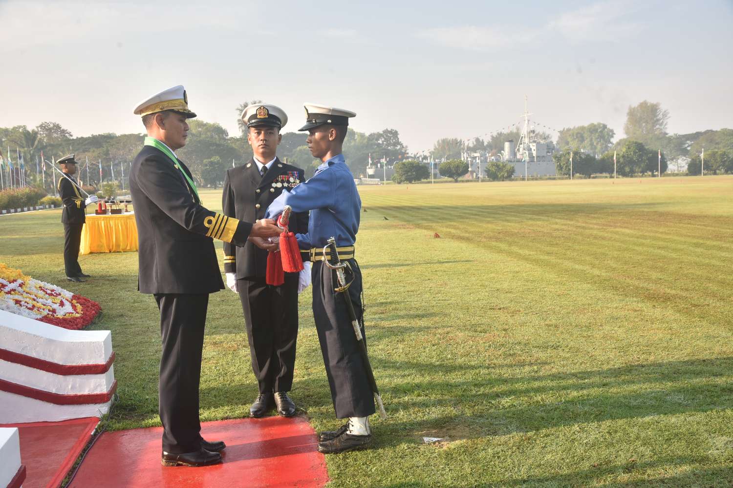 ယင်းနောက် ကာကွယ်ရေးဦးစီးချုပ်(ရေ)ရောက်ရှိလာပြီး ကျောင်းဆင်းတပ်ခွဲနှင့် ဂုဏ်ပြုတပ်ခွဲများ၏ အလေးပြုခြင်းကိုခံယူ၍ ကျောင်းဆင်းတပ်ခွဲနှင့် ဂုဏ်ပြုတပ်ခွဲများကို စစ်ဆေးသည်။