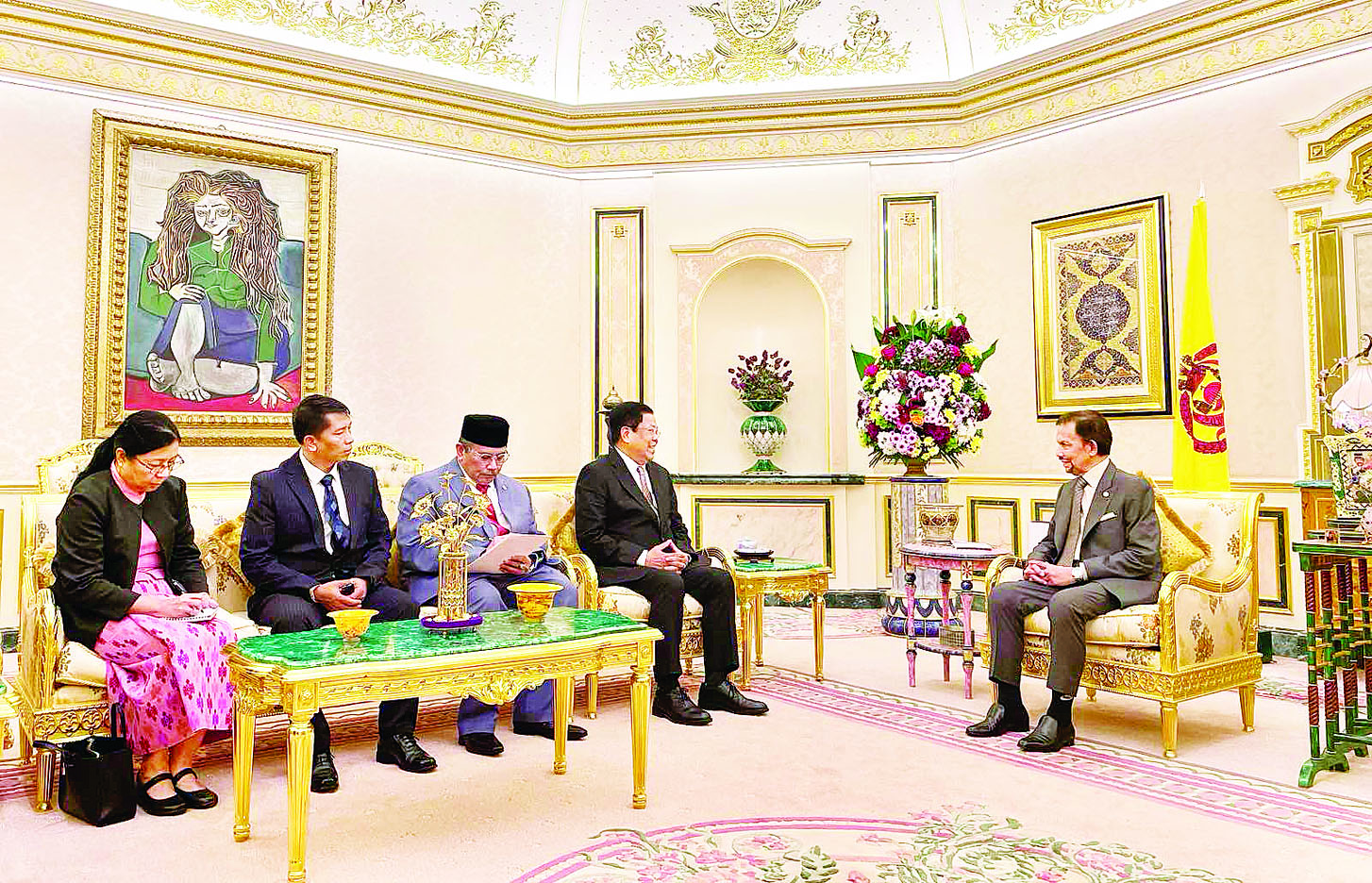 ဒုတိယဝန်ကြီးချုပ်နှင့် ပြည်ထောင်စုဝန်ကြီးသည် ယနေ့နံနက်ပိုင်းတွင် ဘရူနိုင်းဒါရူဆလမ်နိုင်ငံ နိုင်ငံခြားရေးဝန်ကြီး - ၂ နှင့် ASSARRAA VIP Guest House Villa-2 ၌ တွေ့ဆုံဆွေးနွေးပြီး အလုပ်သဘော နေ့လယ်စာစားပွဲသို့ တက်ရောက်သည်။ မွန်းလွဲပိုင်းတွင် ဘရူနိုင်းဒါရူဆလမ်နိုင်ငံ ဘုရင်မင်းမြတ် ဆူလ်တန်ဟာဂျီဟာဆာနယ်လ် ဘိုလ် ကီးယားမူအစ်ဇာဒင်ဝါဒူလာအား Istana Nurul Iman နန်းတော်၌ ဂါရဝပြုတွေ့ဆုံသည်။