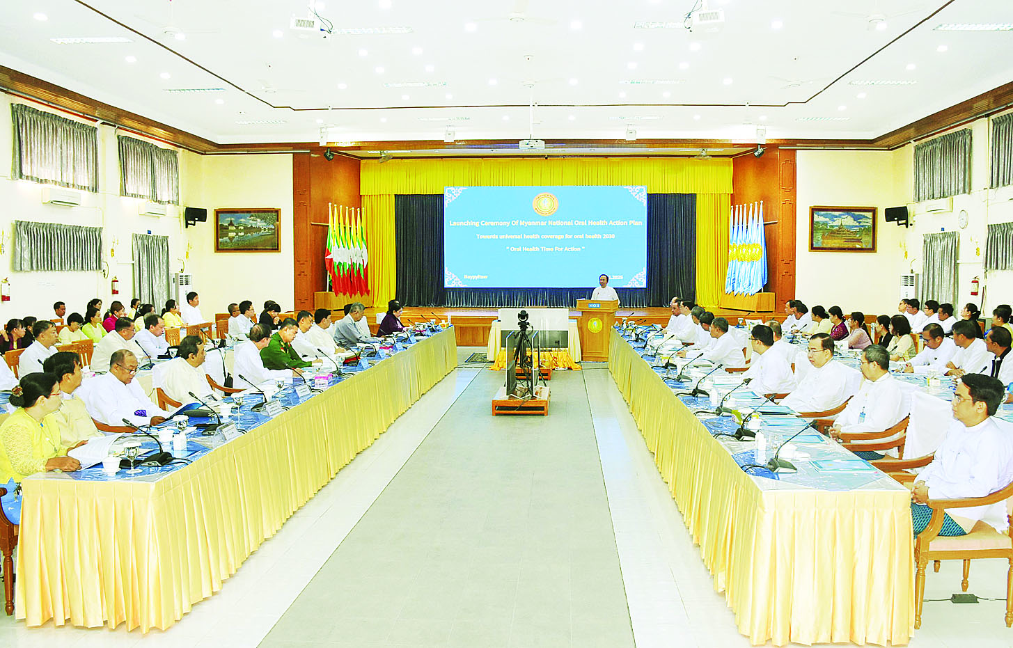 မြန်မာနိုင်ငံ သွားနှင့်ခံတွင်းကျန်းမာရေးစောင့်ရှောက်မှု စီမံချက်အသိပေးခြင်း အခမ်းအနားကို ယနေ့နံနက်ပိုင်းက နေပြည်တော်ရှိ ကျန်းမာရေးဝန်ကြီးဌာန အစည်းအဝေးခန်းမ၌ ကျင်းပသည်။