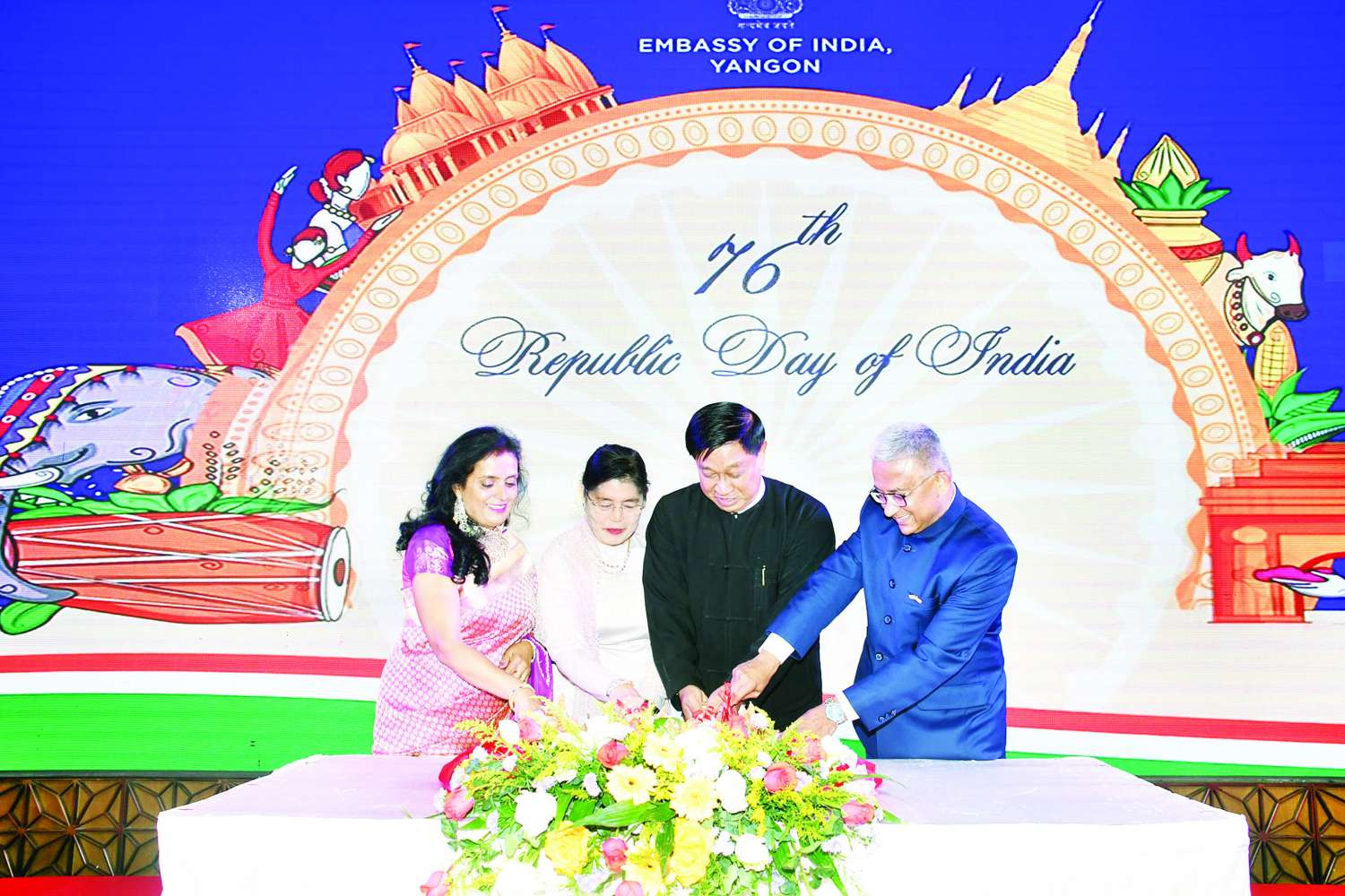 ထို့နောက် ဒုတိယဝန်ကြီးချုပ်နှင့် ပြည်ထောင်စုဝန်ကြီး ဗိုလ်ချုပ်ကြီး တင်အောင်စန်းနှင့်ဇနီး၊ မြန်မာနိုင်ငံဆိုင်ရာ အိန္ဒိယနိုင်ငံသံအမတ်ကြီး H.E.Mr.Abhay Thakurနှင့် ဇနီးတို့သည် အိန္ဒိယသမ္မတနိုင်ငံ၏ (၇၆) နှစ်မြောက် အမျိုးသားနေ့အထိမ်းအမှတ် ကိတ်မုန့်ကို လှီးဖြတ်ပေးကြသည်။