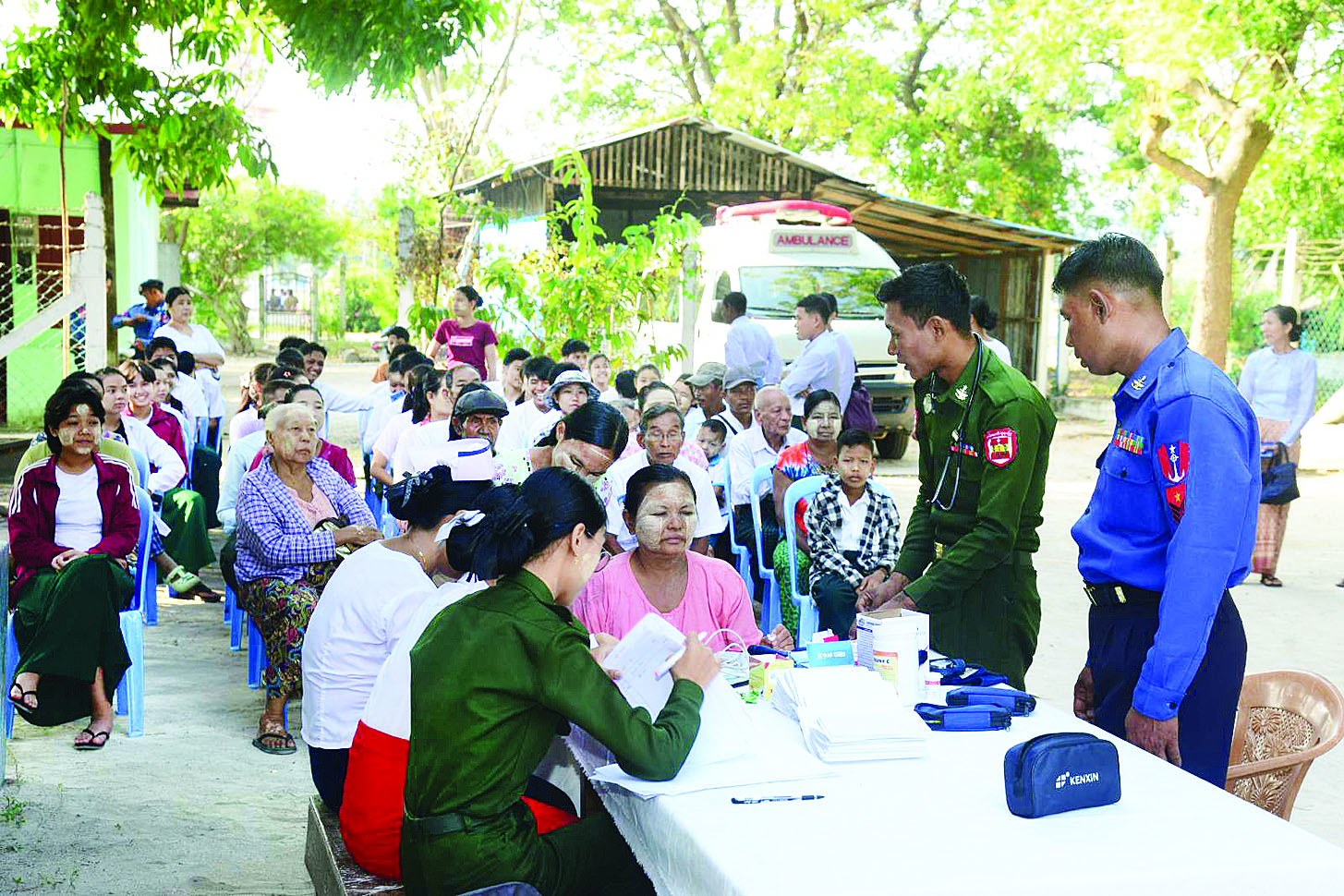 ထိုသို့ ဆောင်ရွက်ပေးရာတွင် ဆေးကုသမှုဆိုင်ရာရောဂါ ၅၁ ဦး၊ ခွဲစိတ်ရောဂါ ငါးဦး၊ သားဖွား/မီးယပ်ရောဂါ ၁၅ ဦး၊ ကလေးရောဂါ ၁၀ ဦး၊ အရိုးရောဂါ ၂၅ ဦး၊ နား၊ နှာခေါင်း၊ လည်ချောင်းရောဂါ လေးဦး၊ မျက်စိရောဂါ ၃၅ ဦးနှင့် သွားနှင့်ခံတွင်းရောဂါ ၂၀ တို့ကို လိုအပ်သည့် ဆေးဝါးကုသမှုများ ဆောင်ရွက်ပေးသည်။ ၎င်းတို့အနက် အထွေထွေခွဲစိတ်လူနာ ငါးဦး၊ ဓာတ်မှန်ရိုက်လူနာ ခုနစ်ဦး၊ အာထရာဆောင်းဖြင့် စမ်းသပ်စစ်ဆေးလူနာကိုးဦး၊ ECG စက်ဖြင့် နှလုံးစမ်းသပ်လူနာ ၁၅ ဦးနှင့် ဓာတ်ခွဲစမ်းသပ်လူနာ ၁၅ ဦးတို့ကို ရောဂါရှာဖွေစမ်းသပ်ကုသပေးခြင်းများ ဆောင်ရွက်ပေးပြီး ဆေးရုံတက်ရောက်ကုသရန် လိုအပ်သည့် လူနာနှစ်ဦးတို့ကို နီးစပ်ရာတပ်မတော်ဆေးရုံသို့ တက်ရောက်ကုသနိုင်ရေး စီစဉ်ဆောင်ရွက်ပေးသည်။