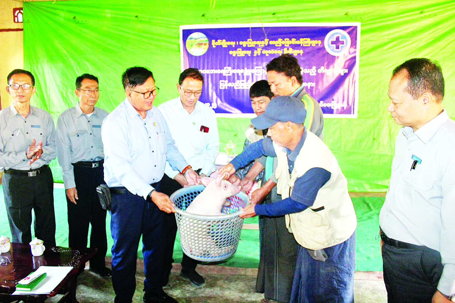 ရာဂီမုန်တိုင်းအရှိန်ကြောင့် ရေကြီးရေလျှံမှုများ ကြုံတွေ့ခဲ့ရပြီး ပျက်စီးဆုံးရှုံးခဲ့ရသည့် မွေးမြူရေးလုပ်ငန်းများ အရှိန်အဟုန်မပြတ် ဆက်လက်ဆောင်ရွက် နိုင်ရေးအတွက် နိုင်ငံတော်အစိုးရ၏ စီမံလမ်းညွှန်မှုဖြင့် မွေးမြူရေးတိရစ္ဆာန် ဝက်ကောင်ရေ ၅၀၀ ပေးအပ်ခြင်းအခမ်းအနားကို ယနေ့တွင် နေပြည်တော် လယ်ဝေးမြို့နယ် ပေါက်မြိုင်ကျေးရွာအုပ်စု ပေါင်းလောင်းကျေးရွာ၌ ကျင်းပရာ စိုက်ပျိုးရေး၊ မွေးမြူရေးနှင့် ဆည်မြောင်းဝန်ကြီးဌာန ဒုတိယဝန်ကြီး ဒေါက်တာအောင်ကြီးနှင့် ဌာနဆိုင်ရာ တာဝန်ရှိသူများ၊ မွေးမြူရေးတောင်သူများ တက်ရောက်ကြသည်။