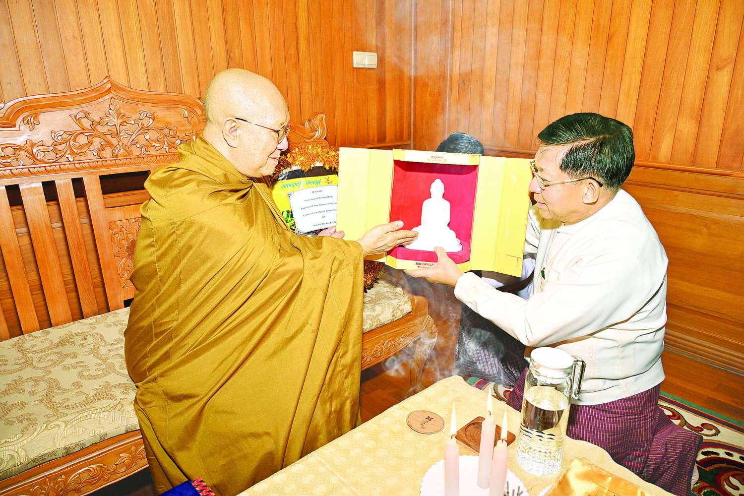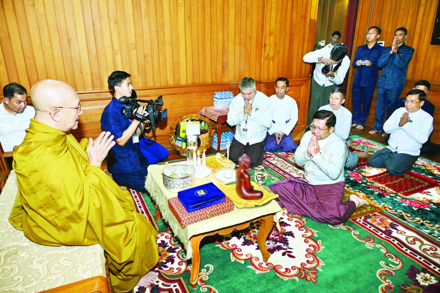 ဦးစွာ နိုင်ငံတော်စီမံအုပ်ချုပ်ရေးကောင်စီဥက္ကဋ္ဌ နိုင်ငံတော်ဝန်ကြီးချုပ်နှင့် အဖွဲ့ဝင်များသည် ကမ္ဘောဒီးယားနိုင်ငံ၏ အဓိပတိဆရာတော်ကြီးနှင့် အဖွဲ့ဝင်များအား ဖူးမြော်ကြည်ညိုကြသည်။ ထို့နောက် နိုင်ငံတော်စီမံအုပ်ချုပ်ရေးကောင်စီဥက္ကဋ္ဌ နိုင်ငံတော်ဝန်ကြီးချုပ်က သာသနာတော်ထွန်းကားပြန့်ပွားရေးဆိုင်ရာများ၊ ကမ္ဘာပေါ်ရှိထိုင်တော်မူ ကျောက်ဆစ်ဗုဒ္ဓရုပ်ပွားတော်များအနက် ဉာဏ်တော်အမြင့်ဆုံးဖြစ်သည့် မာရဝိဇယဗုဒ္ဓရုပ်ပွားတော်မြတ်ကြီးအား တည်ထားကိုးကွယ်ခဲ့သည့်အခြေအနေများ၊ ယခုကဲ့သို့ ခရီးစဉ်ကြွရောက်လာသည့်အတွက် နိုင်ငံအချင်းချင်းချစ်ကြည်ရင်းနှီးမှုကို ပိုမိုခိုင်မာစေမည်ဖြစ်ပြီး သာသနာတော်ဆိုင်ရာကိစ္စရပ်များကို ပိုမိုပူးပေါင်းဆောင်ရွက်နိုင်မည့်အခြေအနေများ၊ မြန်မာနိုင်ငံအနေဖြင့် ထေရဝါဒဗုဒ္ဓသာသနာတော်ထွန်းကား ပြန့်ပွားရေးဆိုင်ရာများကို စဉ်ဆက်မပြတ် ဆောင်ရွက်လျက်ရှိသည့် အခြေအနေများကို လျှောက်ထားတင်ပြသည်။