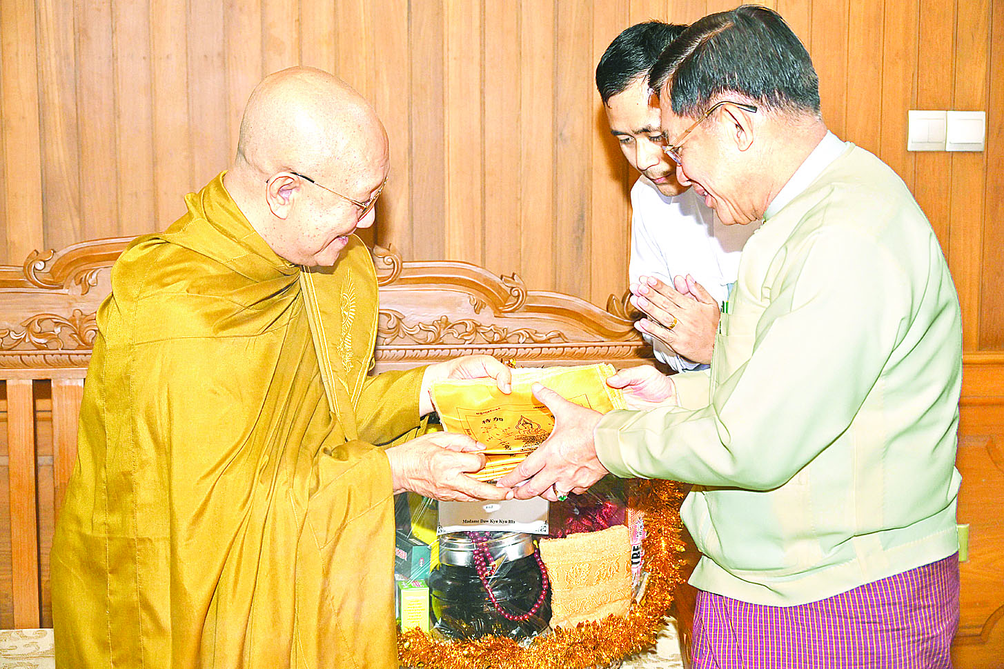 မြန်မာနိုင်ငံသို့ ဘုရားဖူးခရီးစဉ်ရောက်ရှိပြီး နေပြည်တော်ရှိ KMA Hotel ၌ ခေတ္တသီတင်းသုံးတော်မူလျက်ရှိသည့် ကမ္ဘောဒီးယားနိုင်ငံ၏ အဓိပတိဆရာတော်ကြီးတစ်ပါးဖြစ်သော His Holiness Samdech Preah Abhisiri Sugandha Mohasangharajah Dhipadi Dr. Bour Kry ဦးဆောင်သည့် ဆရာတော်၊ သံဃာတော်များအား ယနေ့ညနေပိုင်းတွင် နိုင်ငံတော်စီမံအုပ်ချုပ်ရေးကောင်စီဥက္ကဋ္ဌ နိုင်ငံတော်ဝန်ကြီးချုပ် ဗိုလ်ချုပ်မှူးကြီး မင်းအောင်လှိုင်သည် အဖွဲ့ဝင်များနှင့်အတူ သွားရောက်ဖူးမြော်ကြည်ညိုသည်။