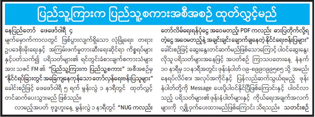 လာမည့်အပတ် ဗုဒ္ဓဟူးနေ့ မွန်းလွဲ ၁ နာရီတွင် “NUG ကလည်း တော်လိမ်ရေးရန်ပုံငွေ အဝေမတည့်၊ PDF ကလည်း ဓားပြတိုက်လို့ရတဲ့ငွေ အဝေမတည့်နဲ့ အချင်းချင်းချောက်ချနေတဲ့ နိုင်ငံရေးဗန်းပြများ” ခေါင်းစဉ်ဖြင့် ဆွေးနွေးတင်ဆက်မည်ဖြစ်သောကြောင့် ပါဝင်ဆွေးနွေးလိုသူ ပရိသတ်များအနေဖြင့် အပတ်စဉ် ကြာသပတေးနေ့ နံနက် ၁၀ နာရီမှ ၁၁နာရီအတွင်း ဖုန်းနံပါတ် ၀၉-၈၉၉၀၉၉၅၈၅ သို့ အမည်၊ နေရပ်လိပ်စာ၊ အလုပ်အကိုင်နှင့် ပြန်လည်ဆက်သွယ်ရမည့် ဖုန်းနံပါတ်တို့ကို Message ပေးပို့ပါဝင်နိုင်ပြီဖြစ်ကြောင်းနှင့် ပါဝင်လာသည့် ပရိသတ်များ၏ ဖုန်းနံပါတ်များနှင့် ကိုယ်ရေးအချက်အလက်များကို လျှို့ဝှက်ပေးထားမည်ဖြစ်ကြောင်း သိရသည်။