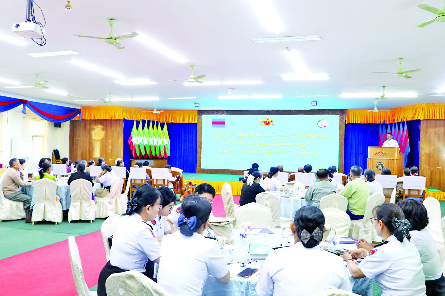 ၂၀၂၄ ခုနှစ် လူဦးရေနှင့်အိမ်အကြောင်းအရာသန်းခေါင်စာရင်း၏ ပြည်ထောင်စုအစီရင်ခံစာနှင့် နေပြည်တော်၊ တိုင်းဒေသကြီး၊ ပြည်နယ်အလိုက် အစီရင်ခံစာများ ရေးသားပြုစုနိုင်ရန် အချက်အလက် အသုံးပြုသူများ၏ အလုပ်ရုံဆွေးနွေးပွဲကို ယနေ့နံနက်ပိုင်းတွင် နေပြည်တော်ရှိ လူဝင်မှုကြီးကြပ်ရေးနှင့် ပြည်သူ့အင်အားဝန်ကြီးဌာန အစည်းအဝေးခန်းမ၌ ကျင်းပရာ လူဝင်မှုကြီးကြပ်ရေးနှင့်ပြည်သူ့အင်အားဝန်ကြီးဌာန ဒုတိယဝန်ကြီး ဒေါက်တာမျိုးသန့်၊ ဌာနဆိုင်ရာတာဝန်ရှိသူများ၊ ဆက်စပ်ဝန်ကြီးဌာနများနှင့် အဖွဲ့အစည်းများမှ ဘာသာရပ်ဆိုင်ရာ ကိုယ်စားလှယ်များနှင့် ဖိတ်ကြားထားသူများ တက်ရောက်ကြသည်။